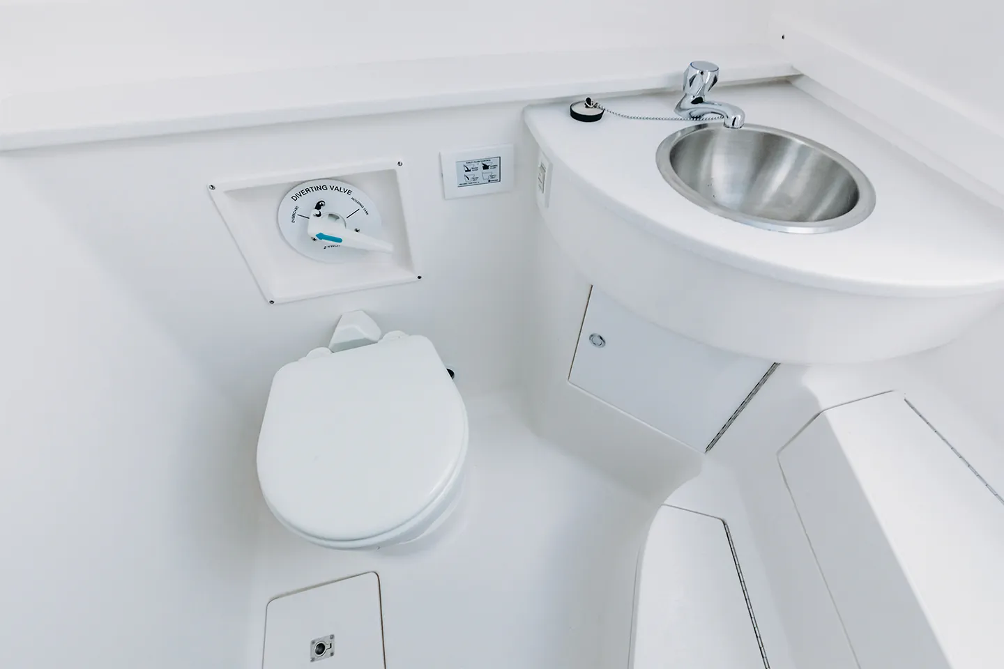 16 Head with separate shower includes a built-in seat, natural light and ventilation. Plenty of stowage for towels and toiletries.