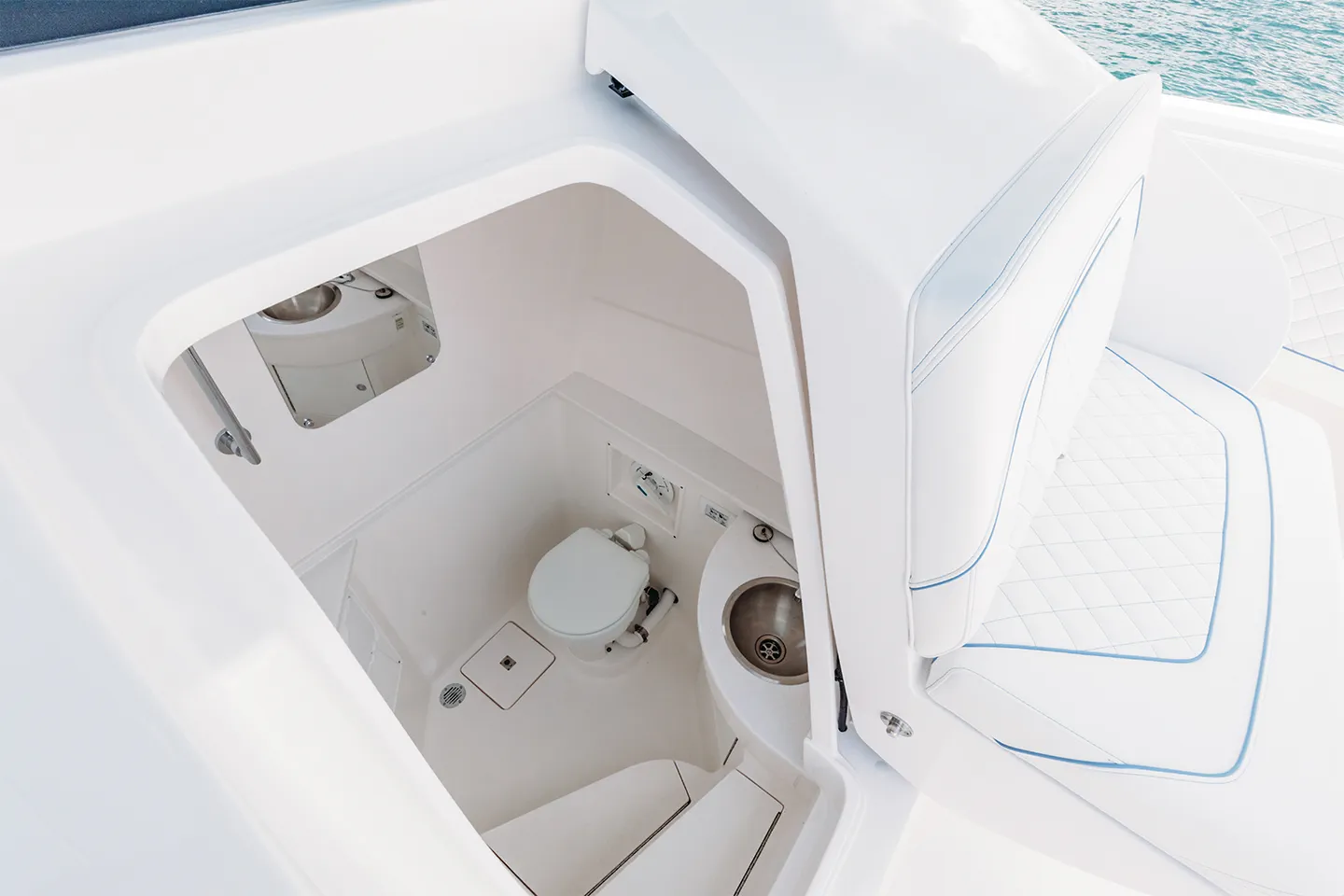 Boasting a more traditional design, the 407 Nomad FE has a front entry into the head and includes many of the same features as the 407 SE. It has a large fuel capacity, superbly smooth, stable ride and an impressive amount of added space in the aft cockpit and beyond. It is perfect for those in the mood for lounging or ready for a battle with the fish.