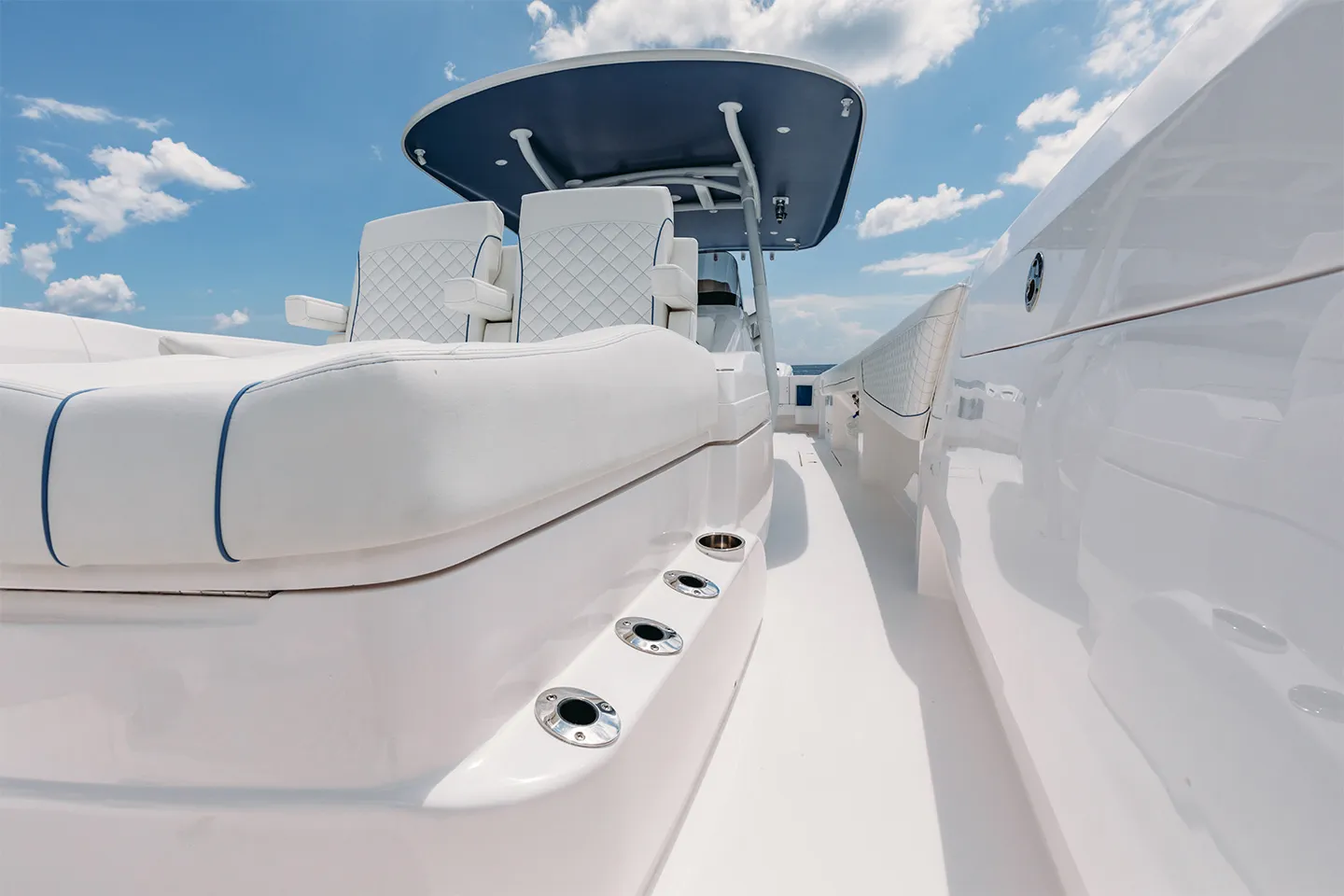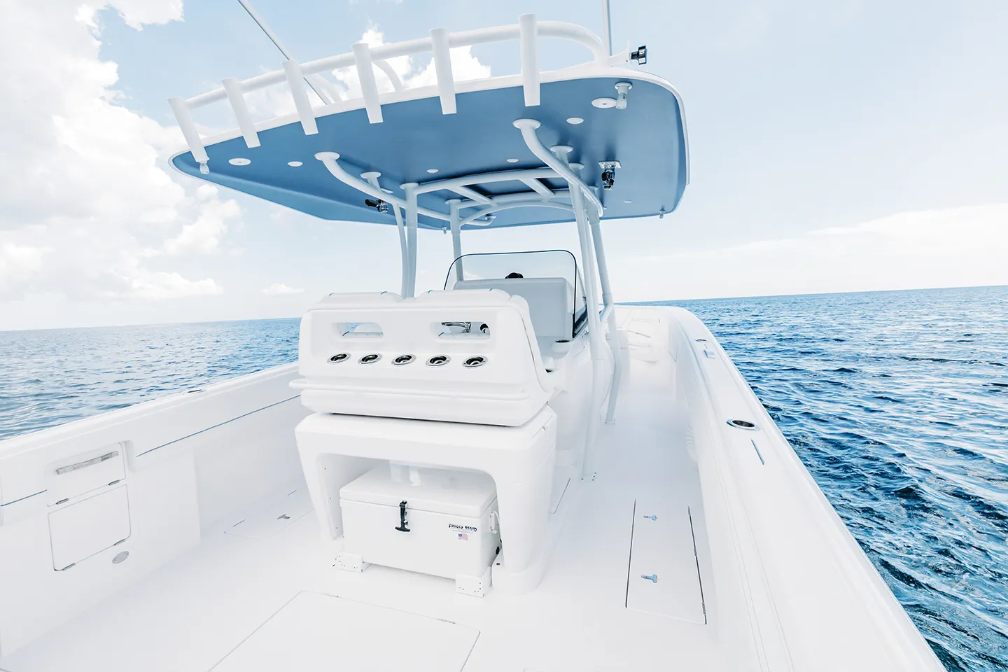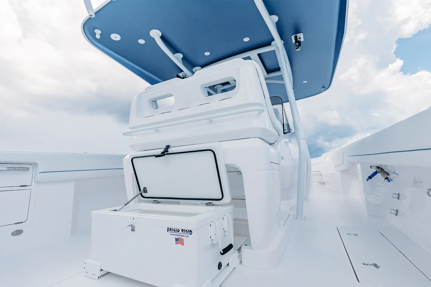 4 Port and Starboard aft above deck storage or optional rigged baitwells with windows makes fishing this aft cockpit more convenient and roomy by not stealing valuable cockpit space.