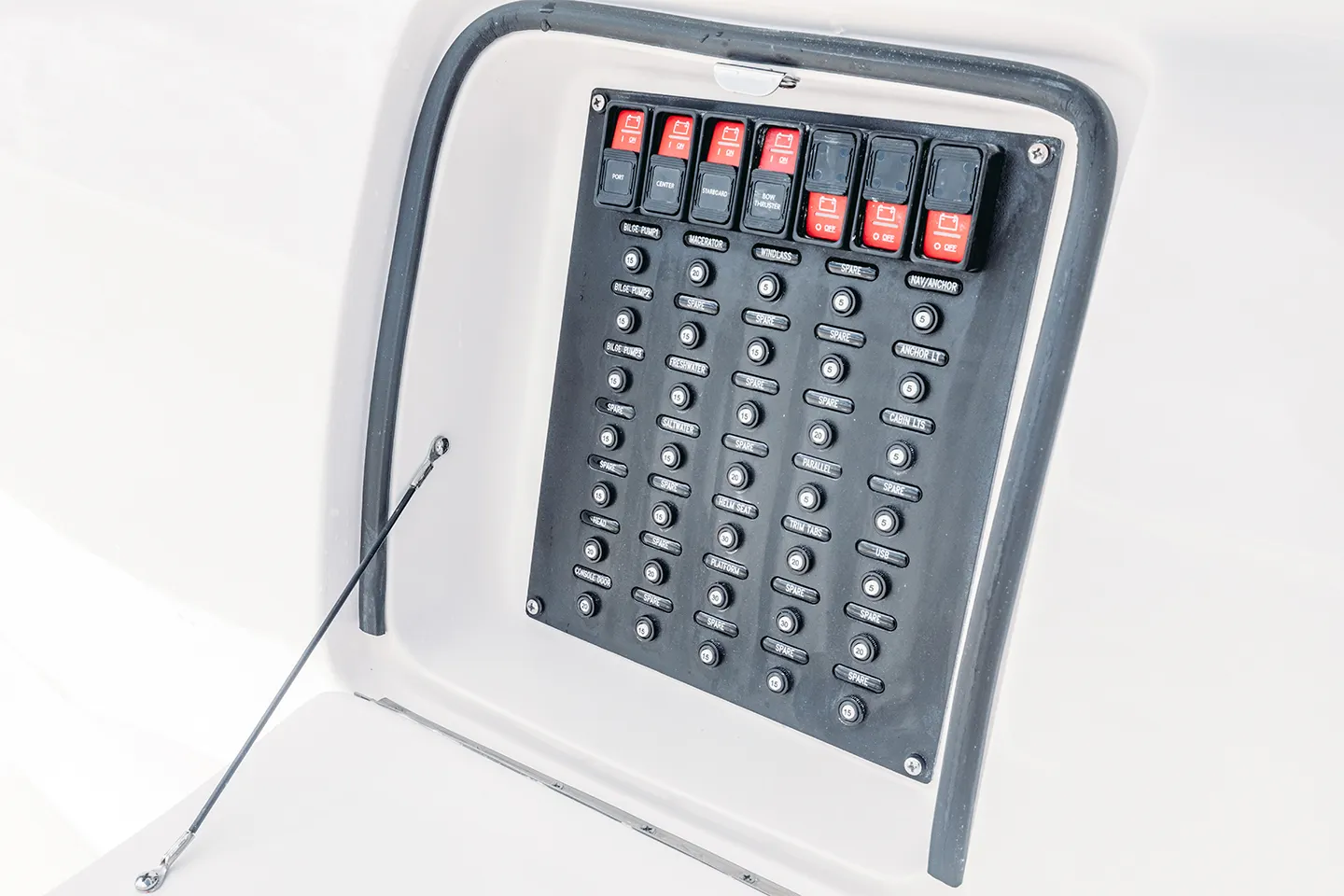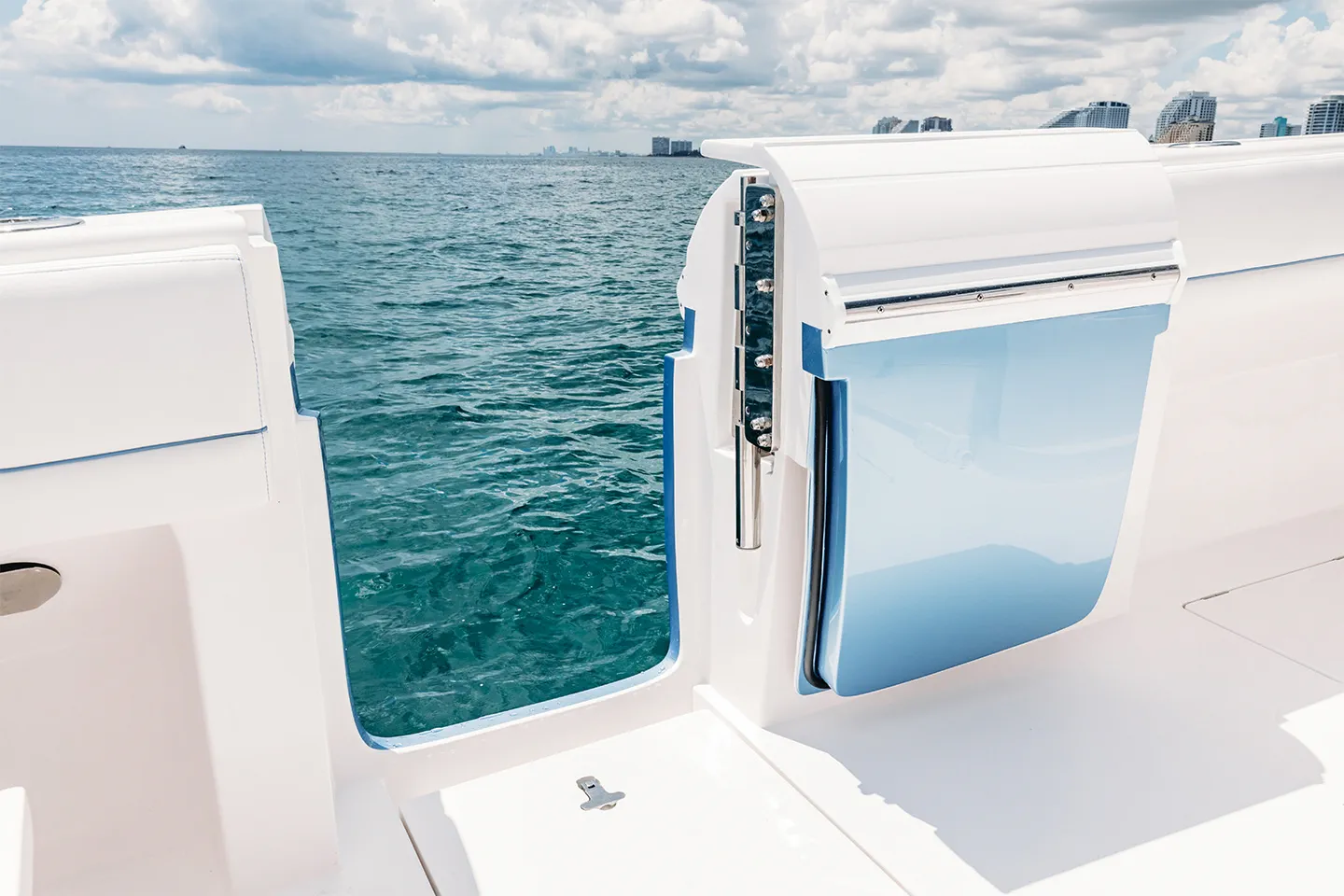 9 Hull side dive door, an Intrepid trademark, with our latest lift up/rotate design that doesn’t take up valuable cockpit space while in the open position. And, it also allows for easy dockside boarding.