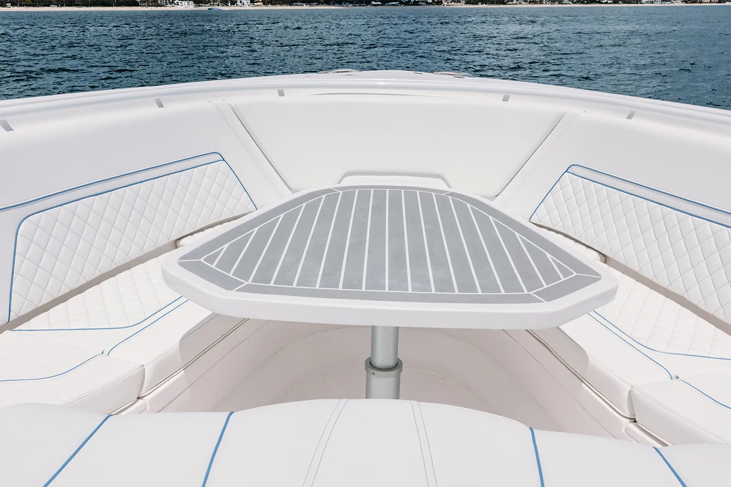 20 This large forward settee area not only has enough room for you and your guests to gather around the table for dinner, but it also converts to an additional berth forward with the optional Hi-Lo table and filler cushion.