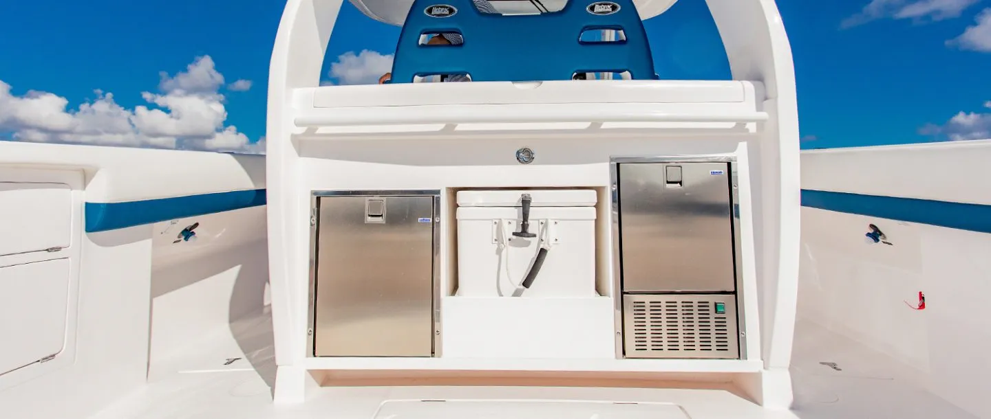 12 Aft cockpit cabinet designed to your needs. A).Refrigerator/Icemaker/grill/sink/slide out cooler B). Fishing station C). Delete for second row seating.