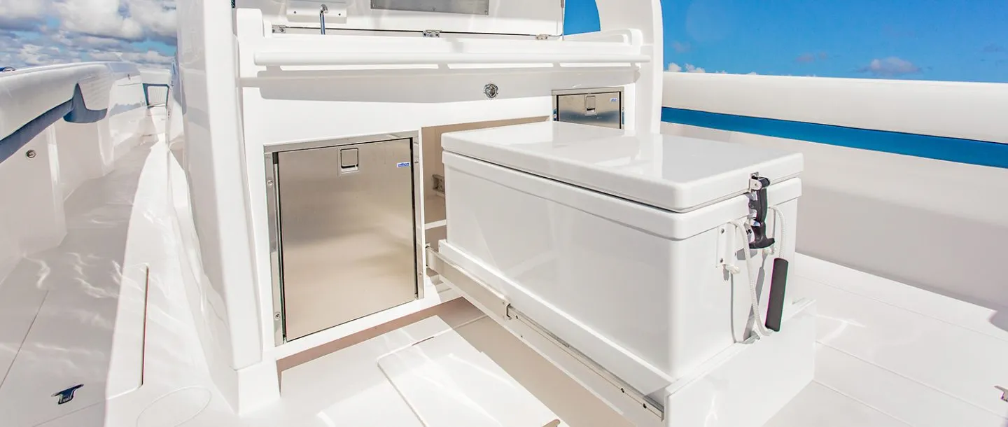 4 Port and Starboard aft above deck storage or optional rigged baitwells with windows makes fishing this aft cockpit more convenient and roomy by not stealing valuable cockpit space.