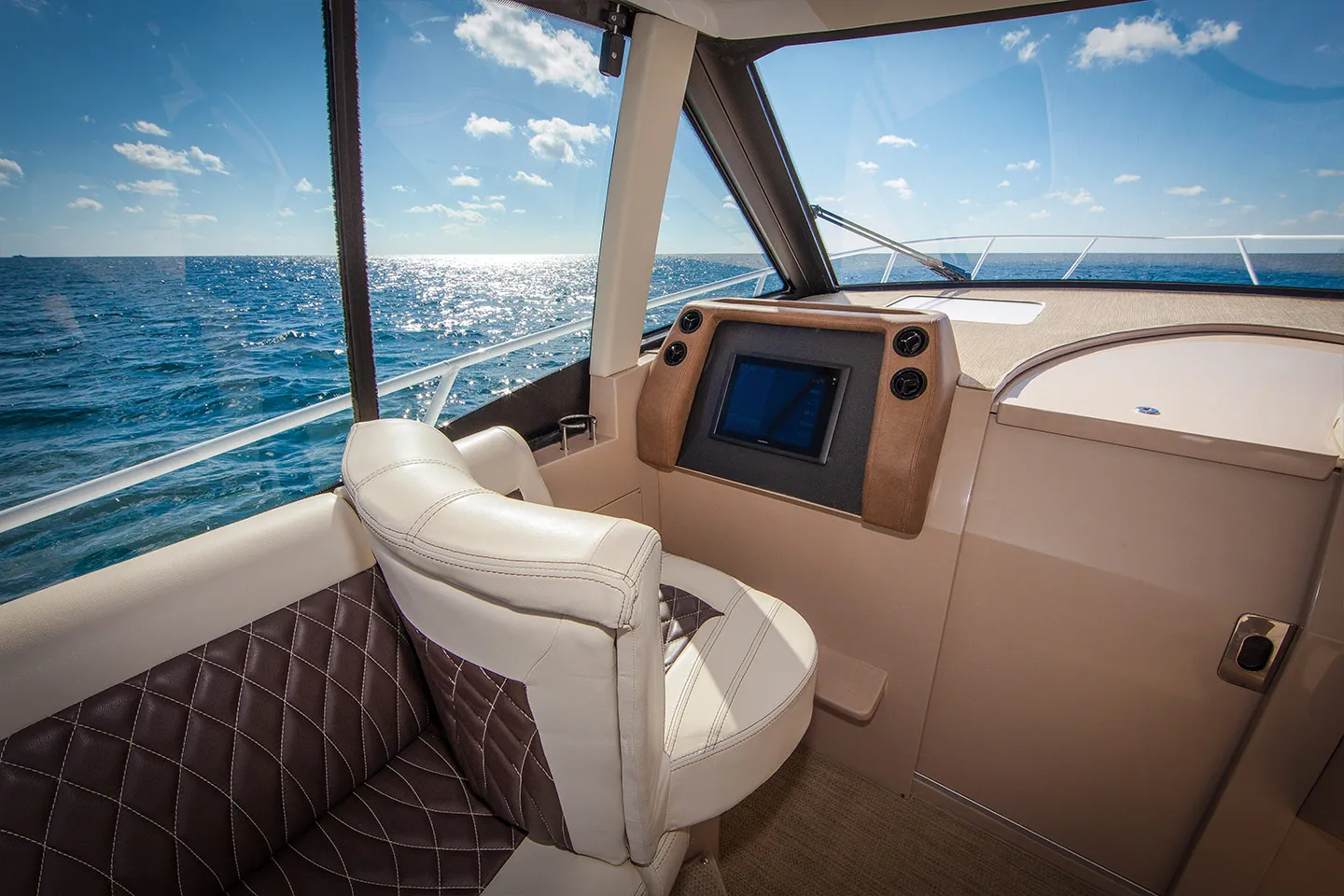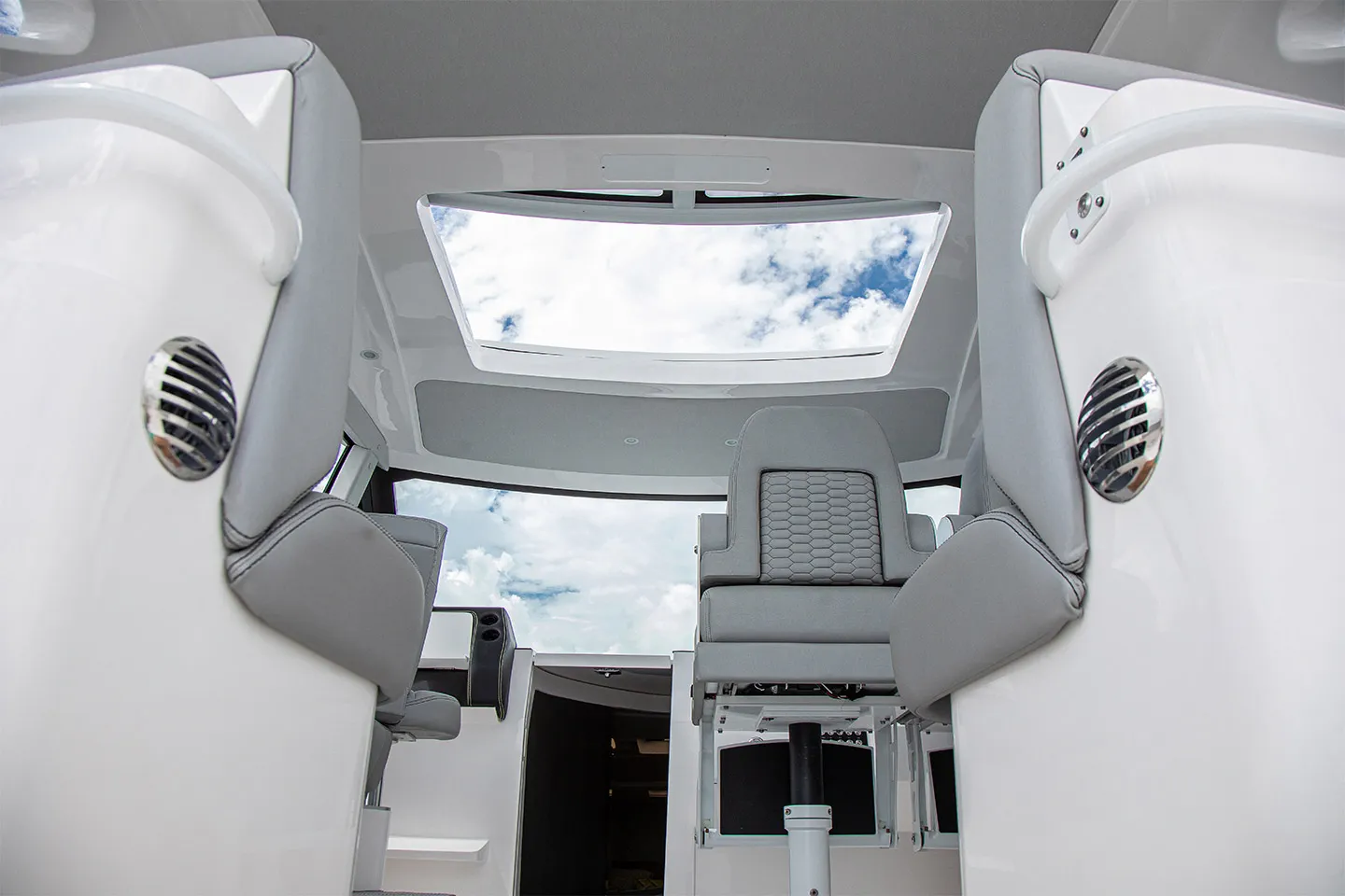 The height of the helm seat is fully adjustable with electronic controls that elevate the seat up and down. The backrest also slides fore and aft with the push of a button. Four folding armrest and two folding footrests make long runs more comfortable. A large dash can accept a full array of flush-mounted electronics.