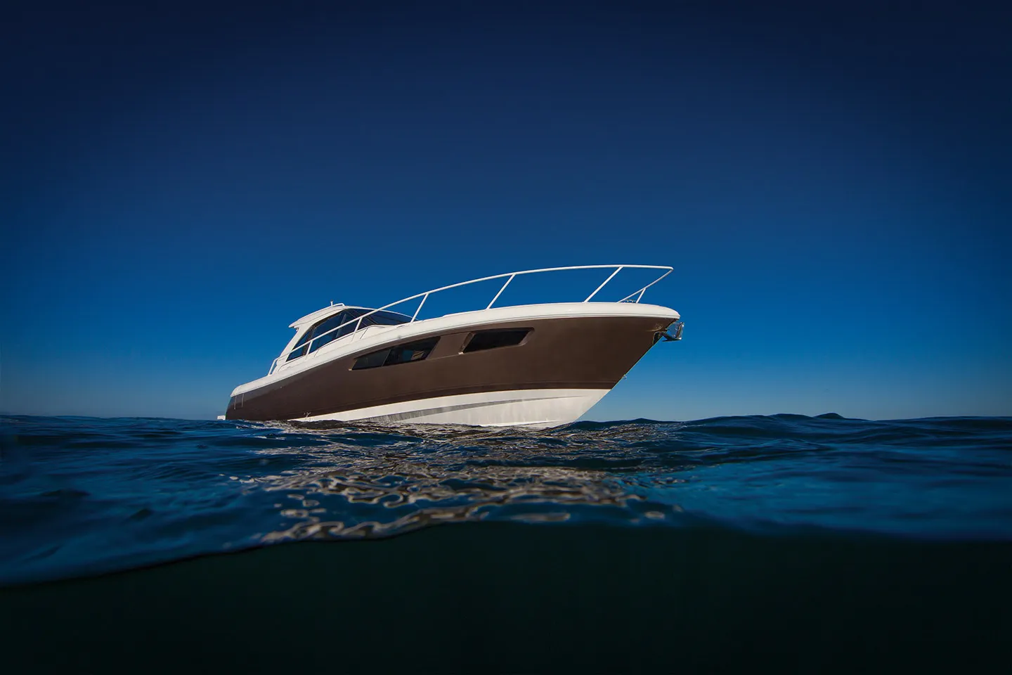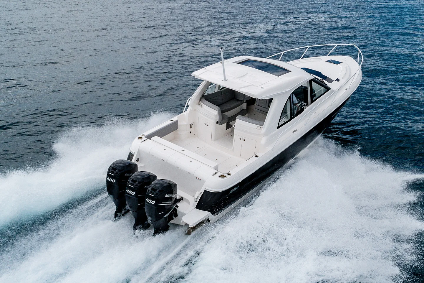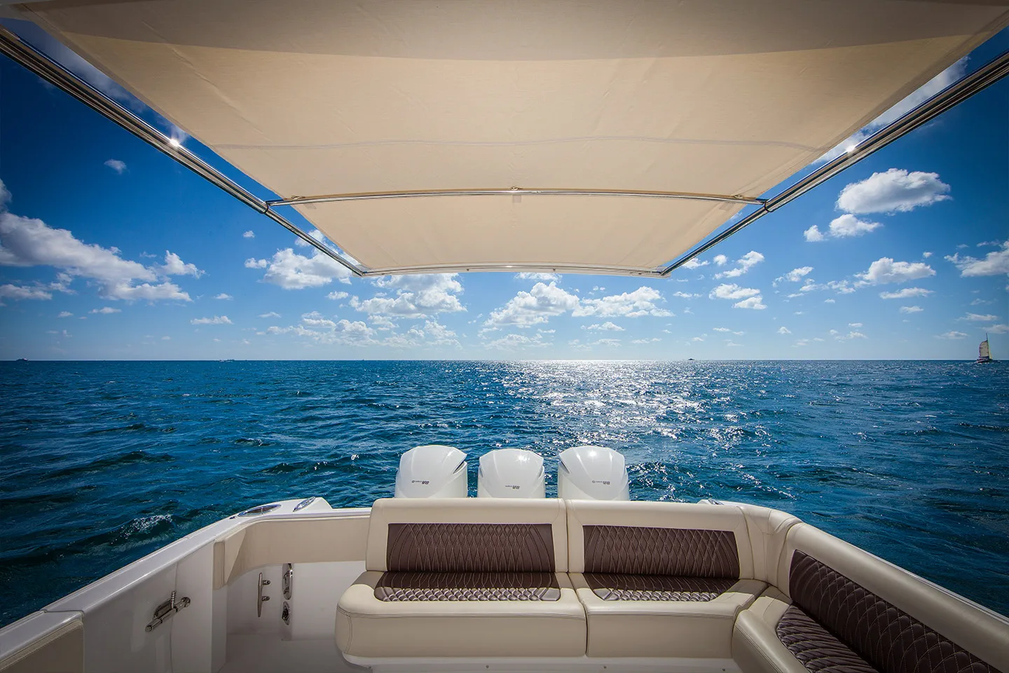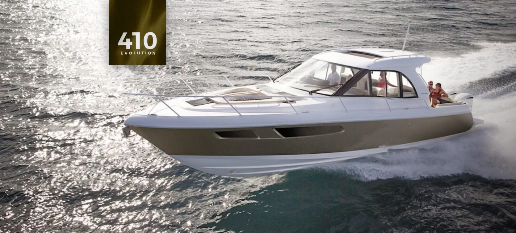 An exquisitely crafted byproduct of 30 years of evolution and 2 years of design, the 410 Evolution has pushed the class of high-end yachts to a new unchartered plateau. This is a 41.19-foot display of power, stability and maneuverability with its revolutionary step hull design and triple outboard engines that don’t sacrifice an inch of cockpit space for performance.