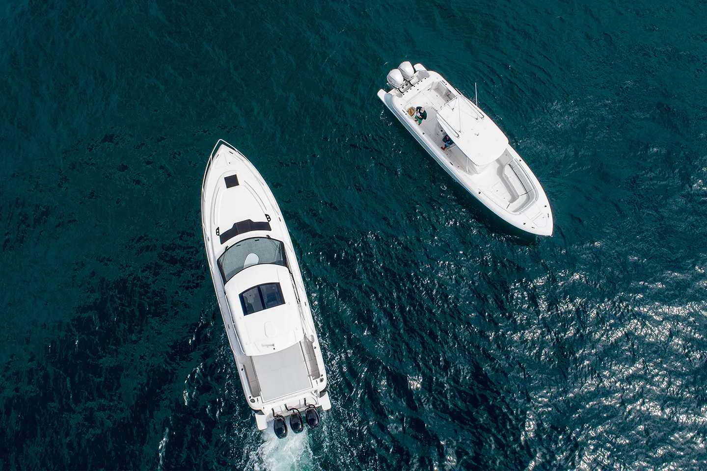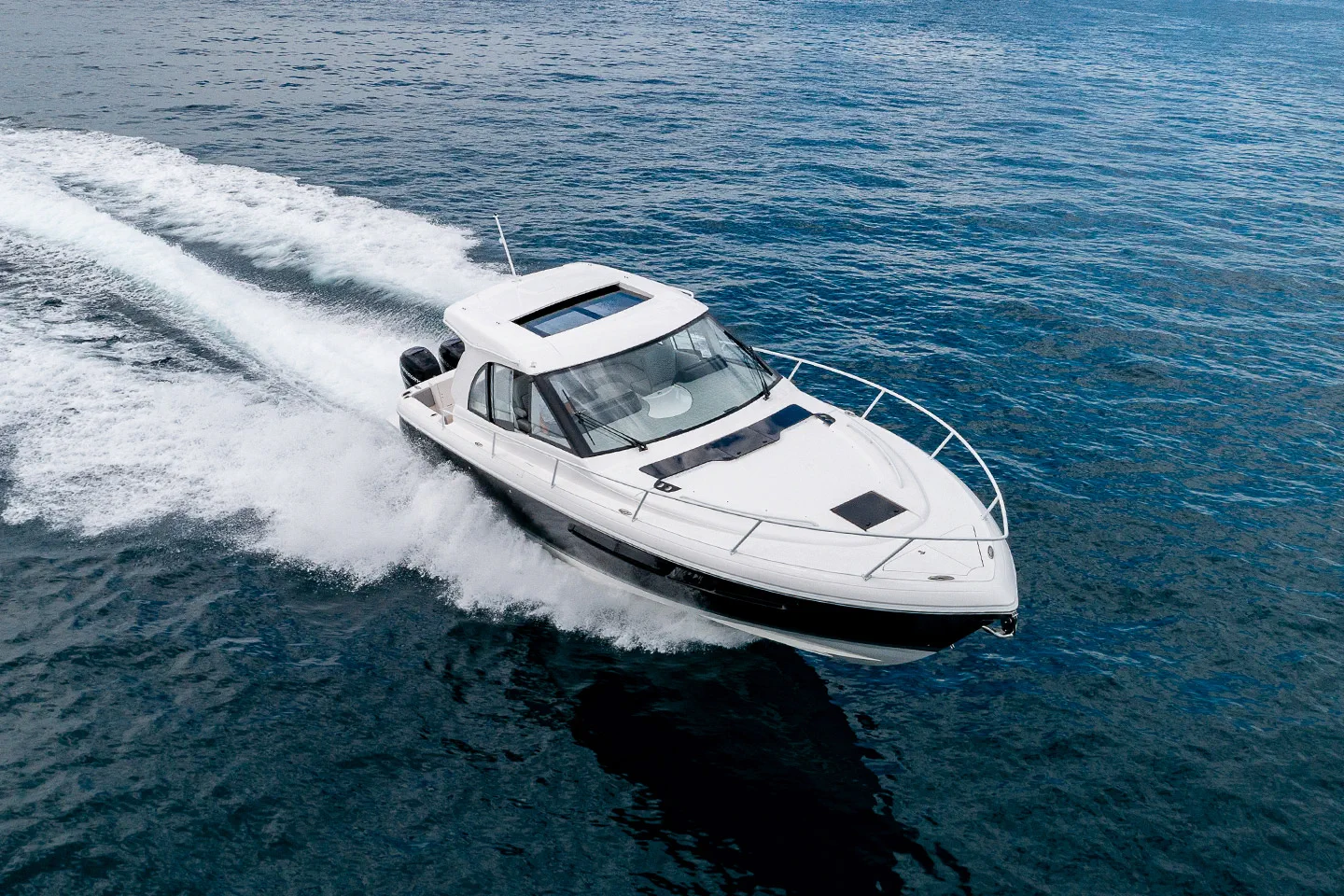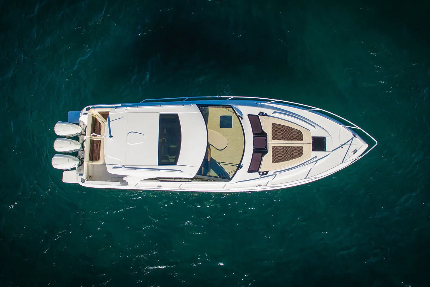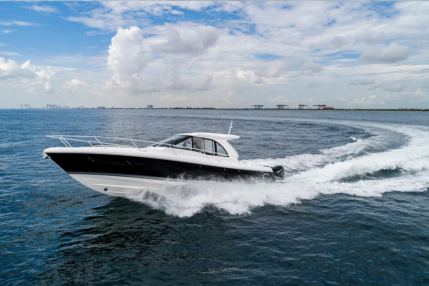 An exquisitely crafted byproduct of 30 years of evolution and 2 years of design, the 410 Evolution has pushed the class of high-end yachts to a new unchartered plateau. This is a 41.19-foot display of power, stability and maneuverability with its revolutionary step hull design and triple outboard engines that don’t sacrifice an inch of cockpit space for performance.