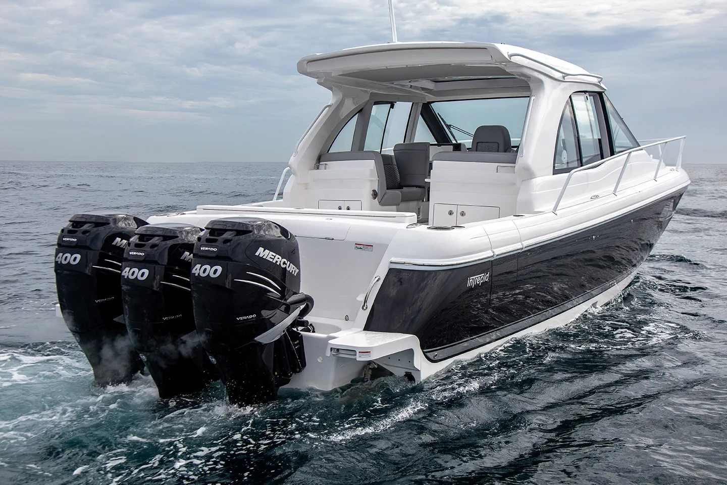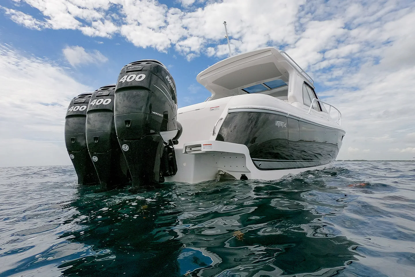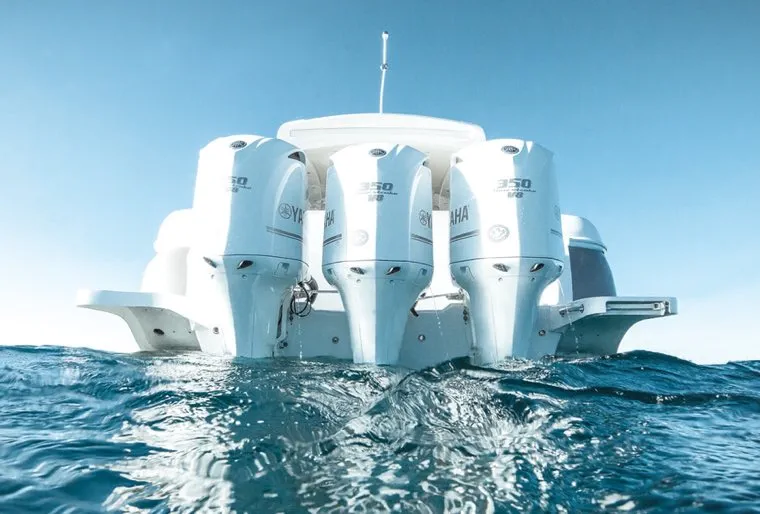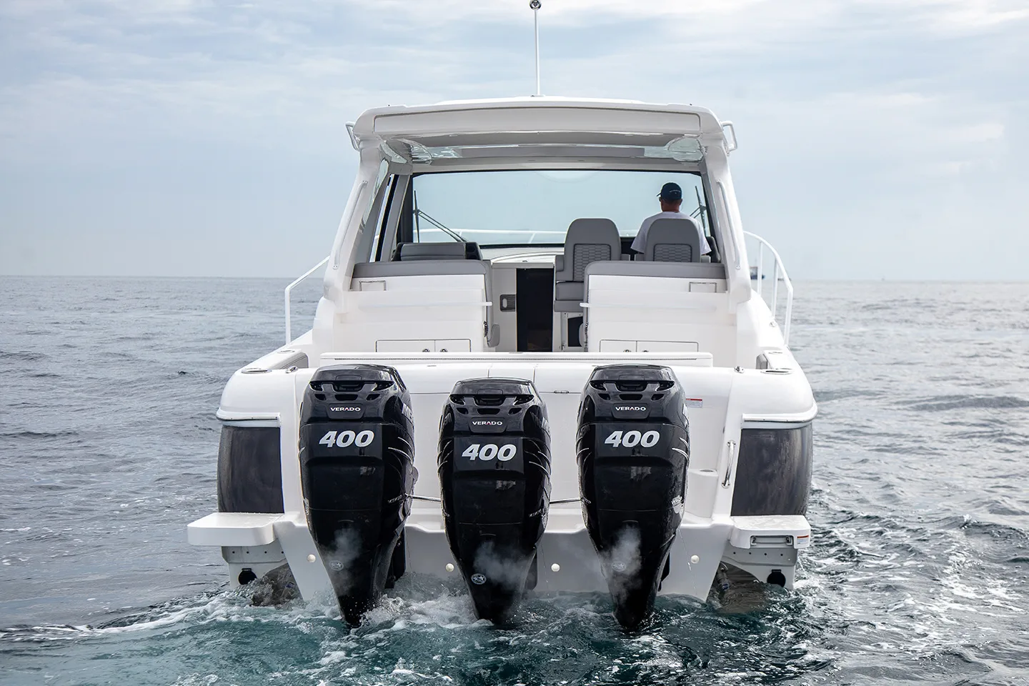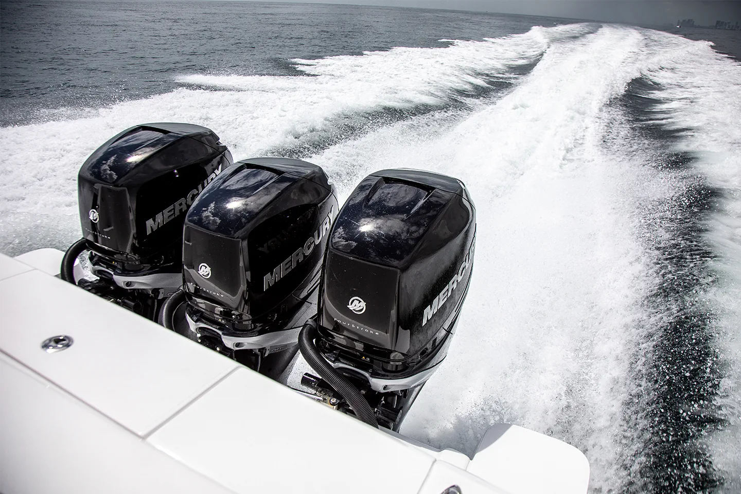 Triple outboard engine configuration maximizes aft cockpit space, as opposed to the space lost with traditional inboard applications.