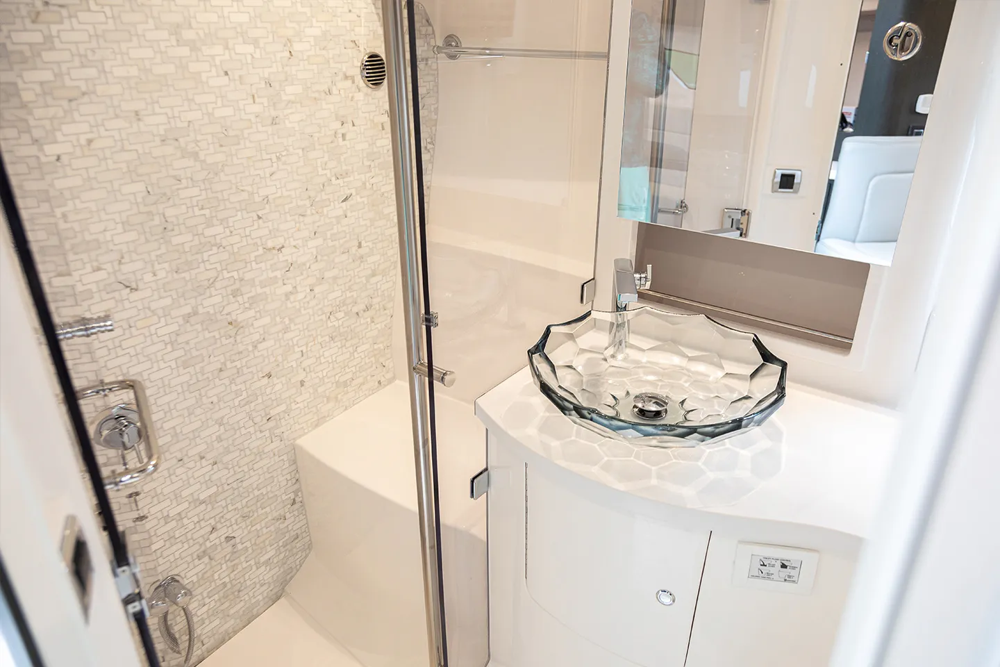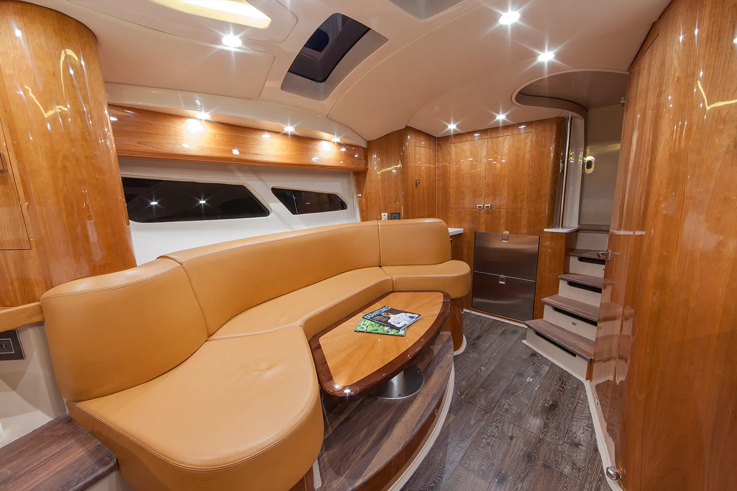 Stepping down, into the cabin, you are greeted by the warmth of beautifully finished woodworking and a U-shaped settee with a table that adjusts to any level with the push of a button. To the port is a fully appointed galley with a cooktop, microwave, and stainless steel refrigerator/freezer. Just aft is a full-sized head with porcelain sink and toilet. A glass enclosure separates the shower. Forward is a queen-sized berth that lifts on power actuators to access additional storage below.