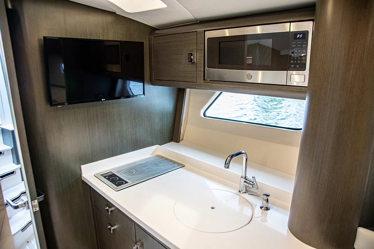 Above the galley is a built-in microwave and a TV on a pull-out swivel.
