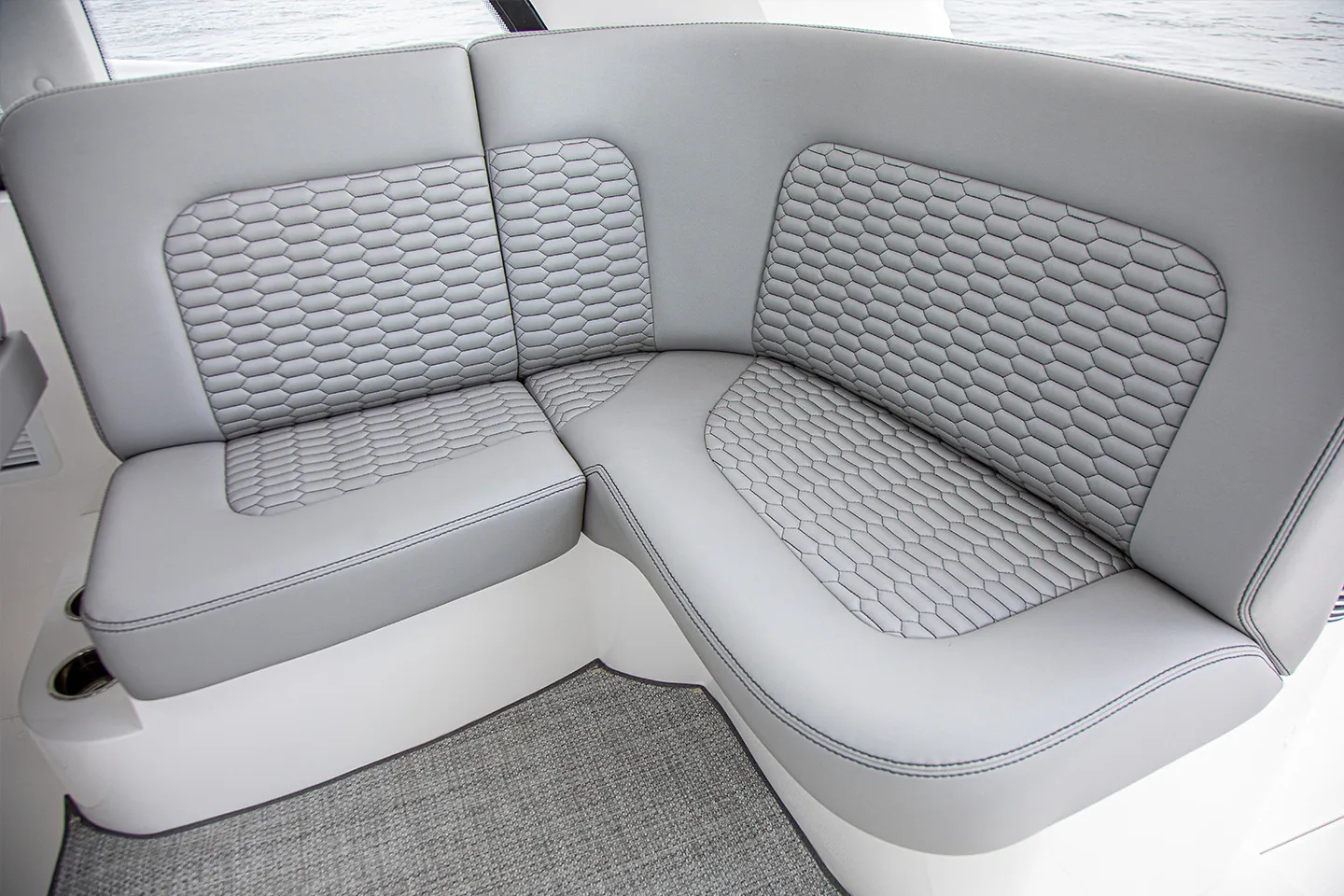 The cockpit itself features an electronic sunroof, and perfectly sculpted and innovatively designed helm seating that converts to create more open seating and conversational space.
