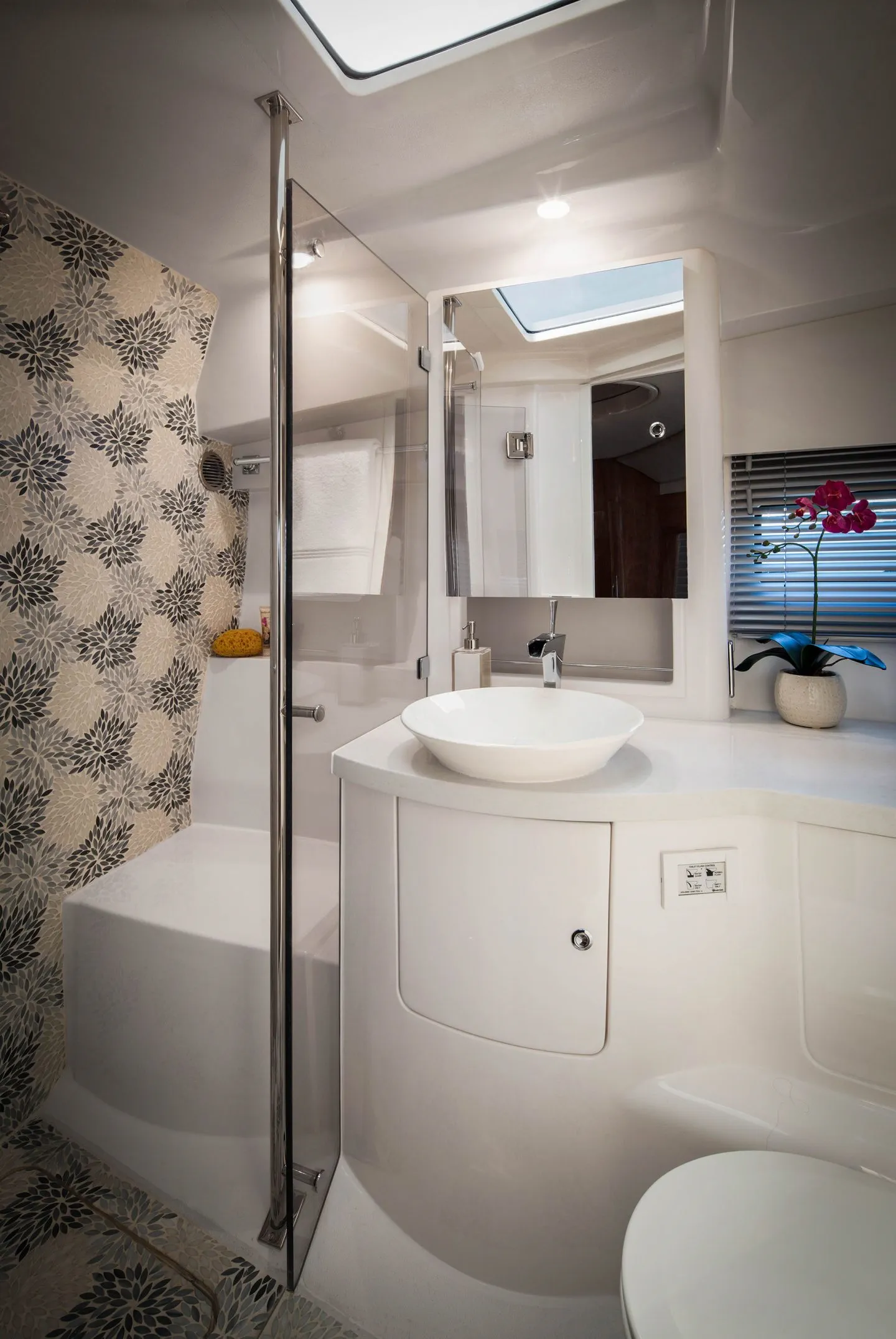 The cabin includes a full-sized head with a porcelain toilet bowl.