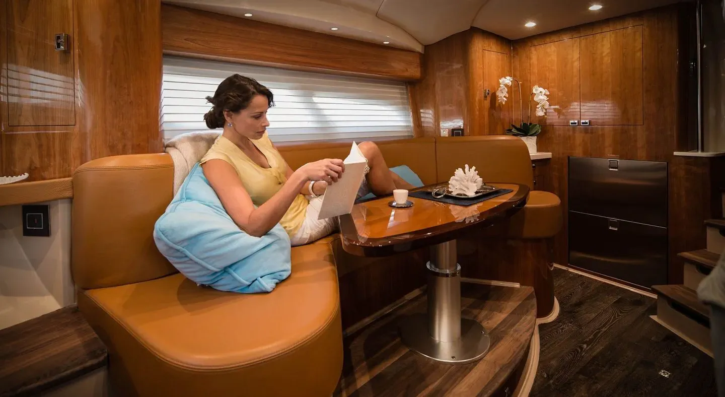 On the starboard side of the cabin is a settee with a power adjustable pedestal base and a solid wood table top.