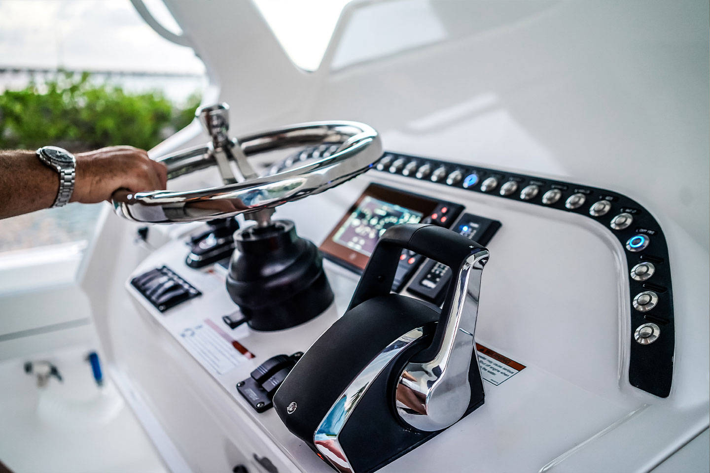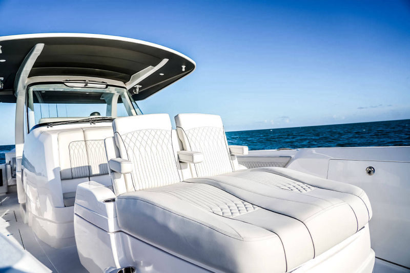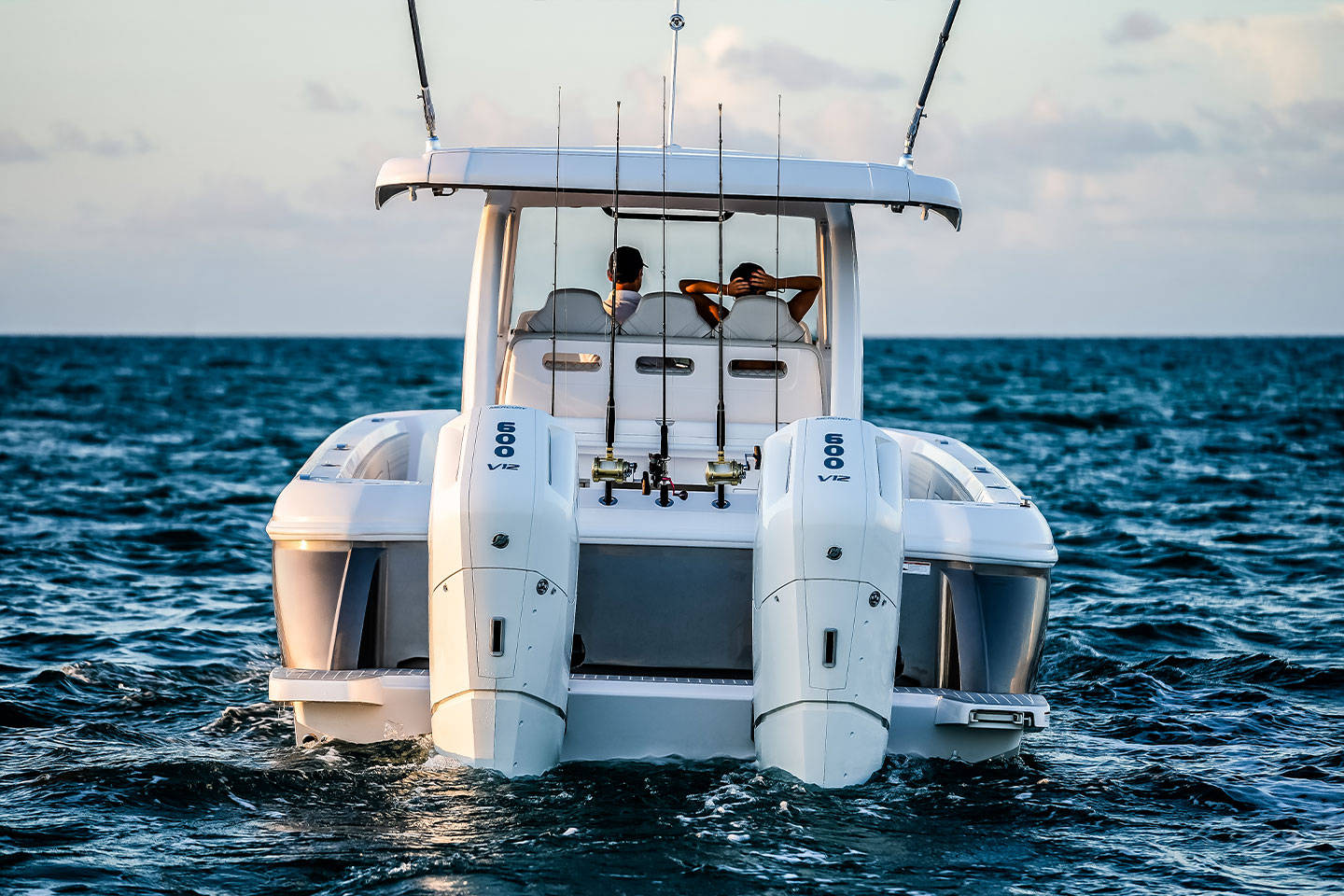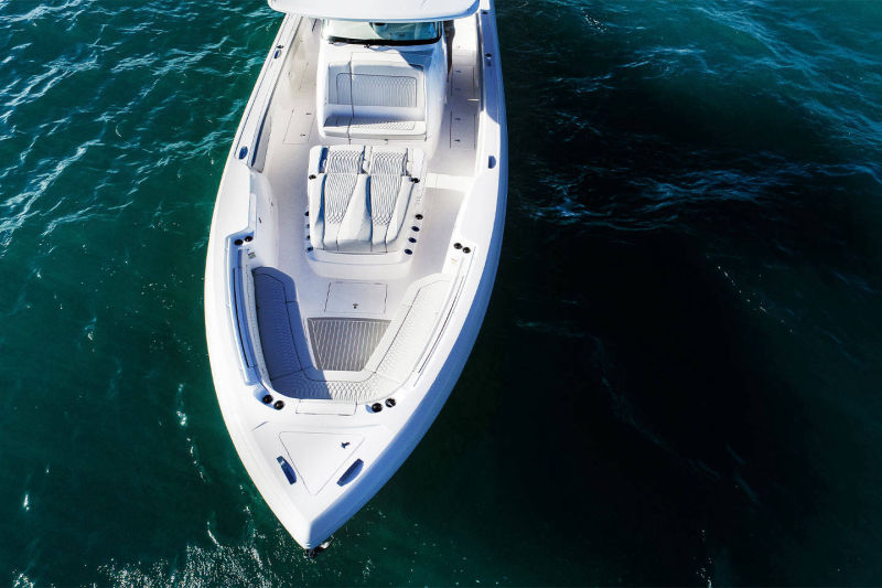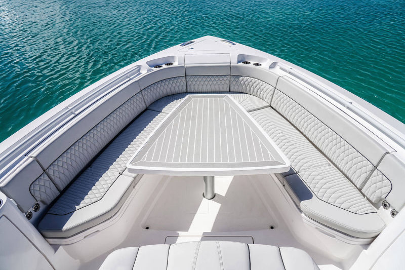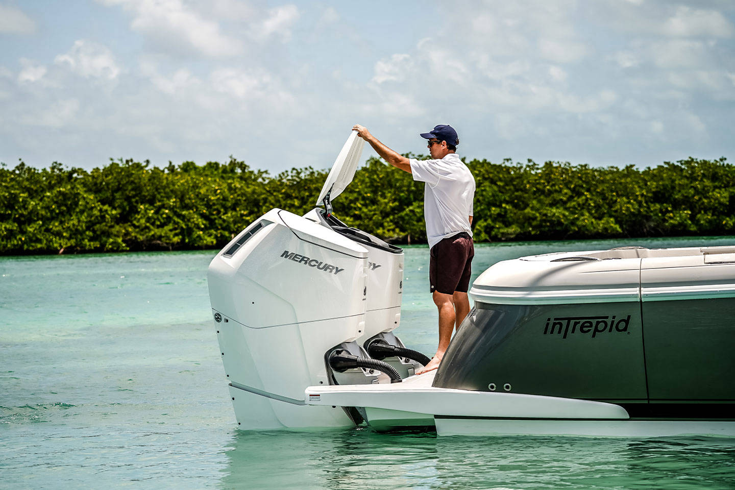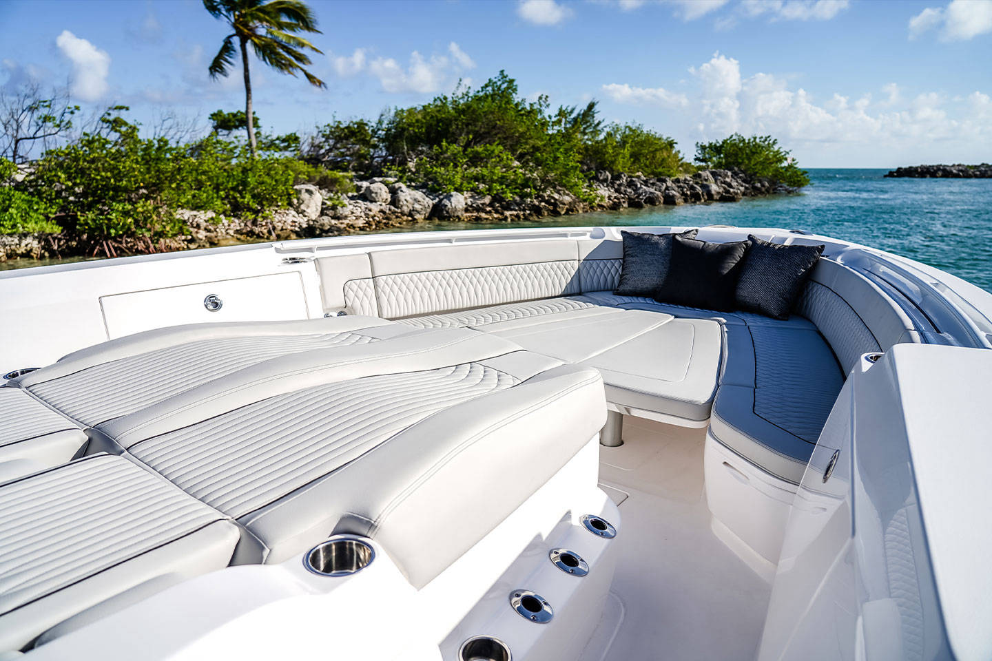 An expanded helm seat station features a full-height, composite T-top and wraparound glass windshield with a wiper for improved visibility and maximum protection from the elements. The wider console provides abundant space for a full array of today’s larger flat-screen electronics. The wider, 12′ 8″ beam and longer hull are perfectly balanced to accommodate the twin to quad engine configurations that let you get out there faster, go farther, and stay longer. Our signature composite stepped hull design provides the incomparably smooth, dry ride, sure-footed handling, and exceptional fuel efficiency that put Intrepid in a class by itself. Luxurious forward seating includes adjustable twin sun pads with a huge storage locker underneath.