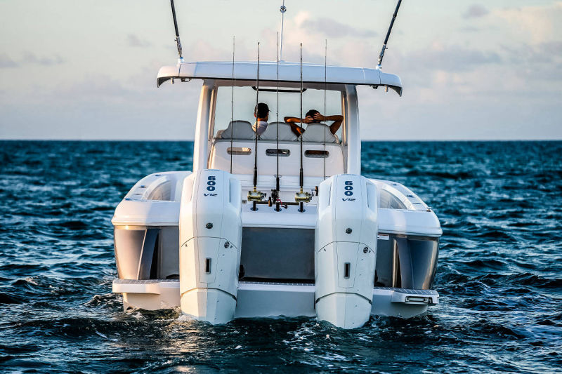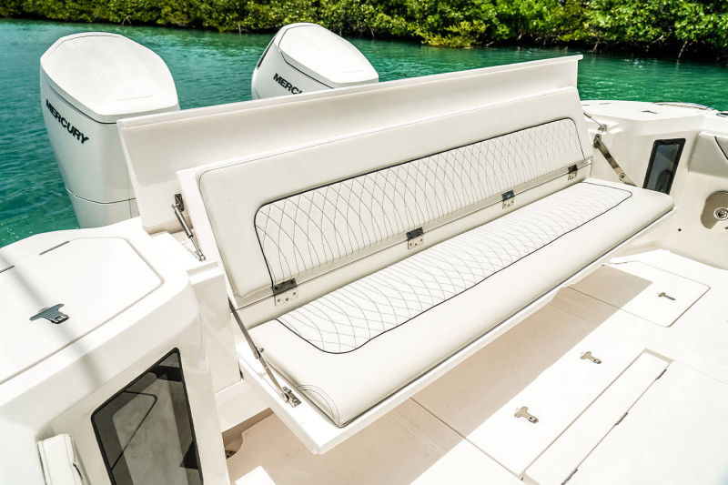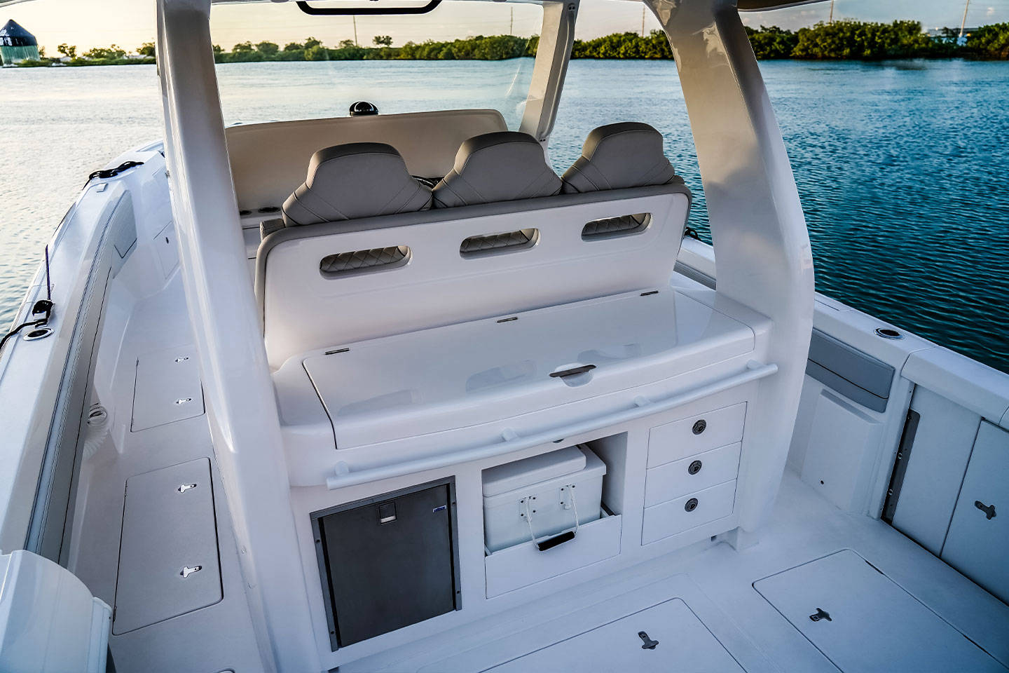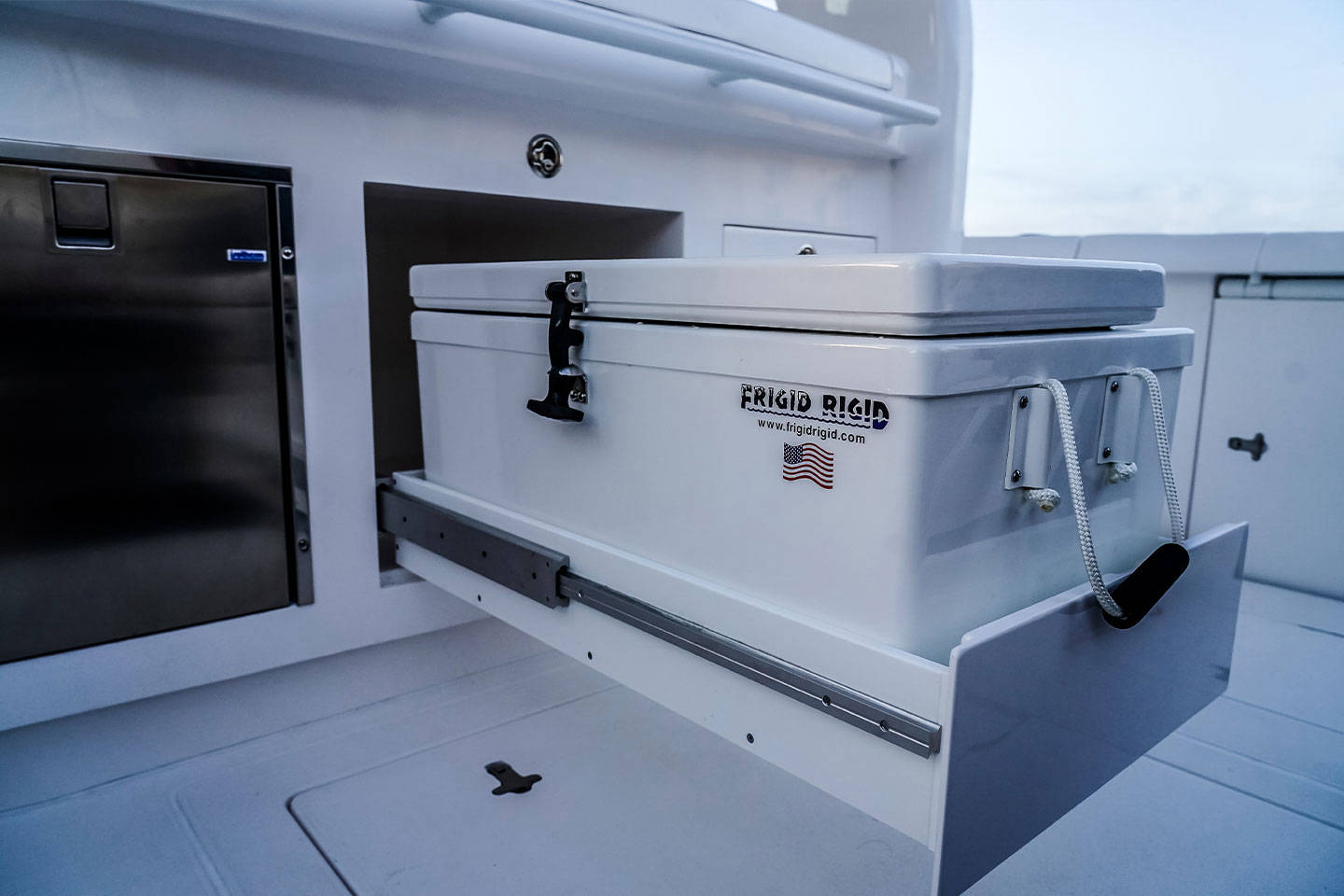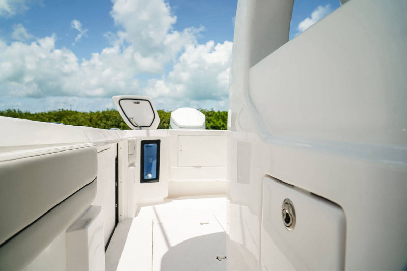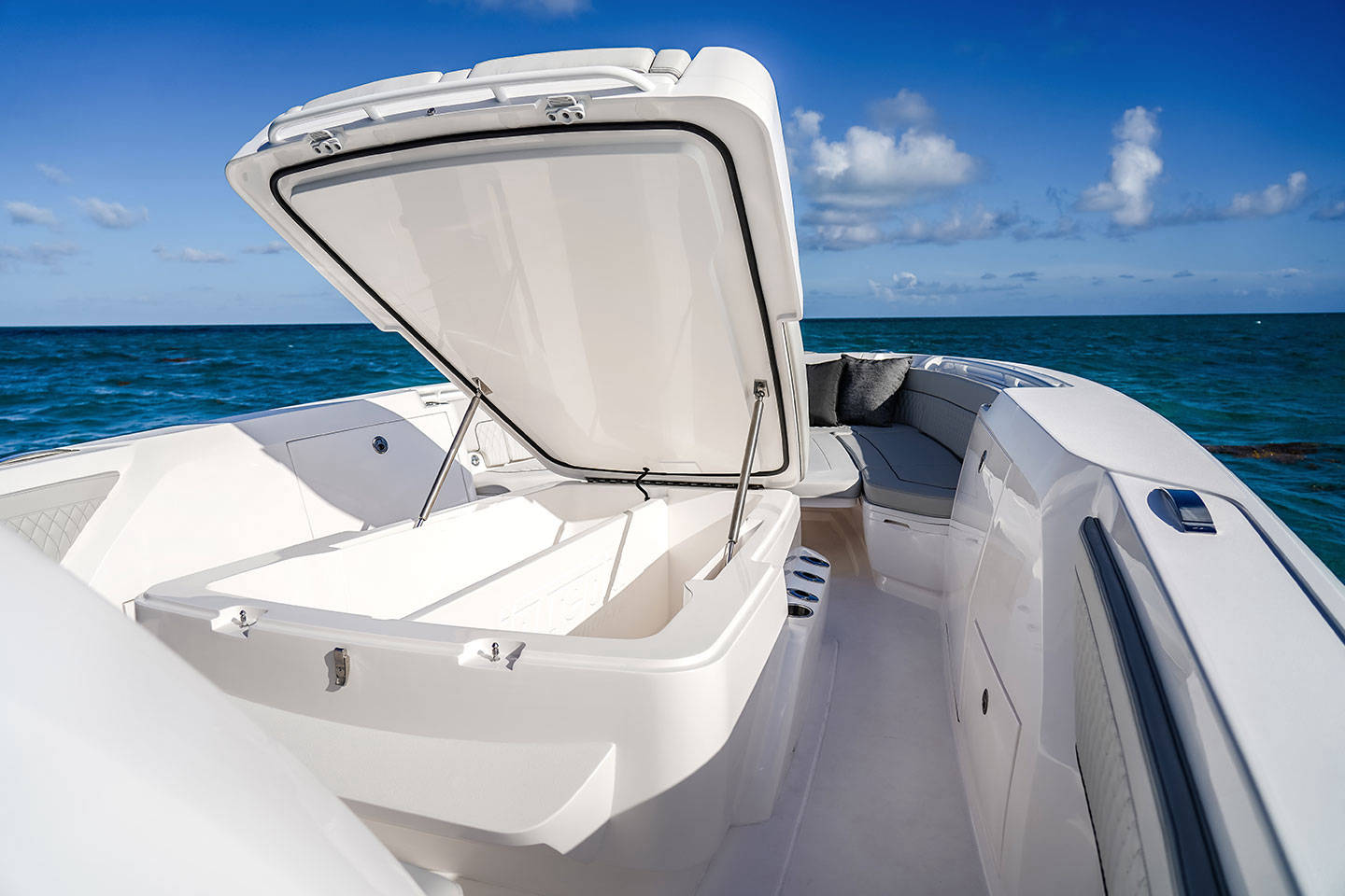 4 Port and Starboard aft above deck storage or optional rigged baitwells with windows makes fishing this aft cockpit more convenient and roomier by not stealing valuable cockpit space.
