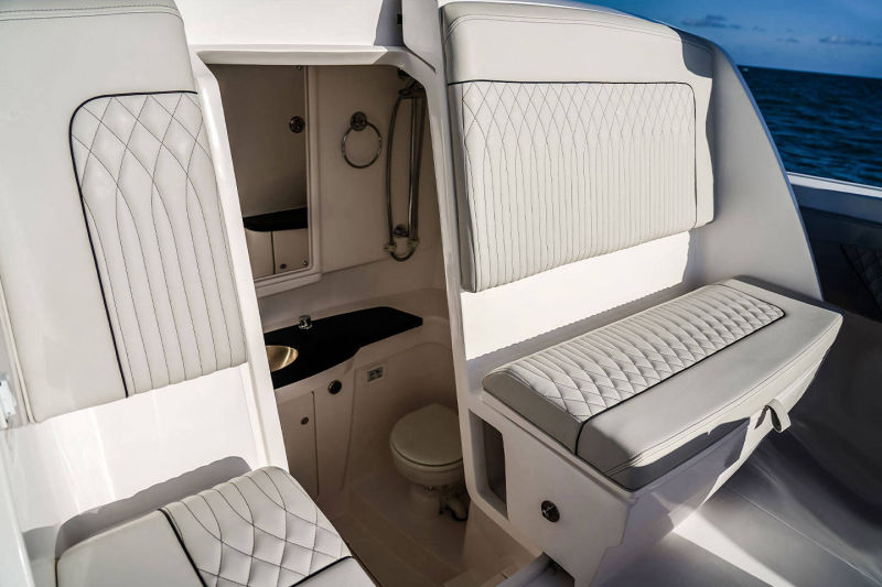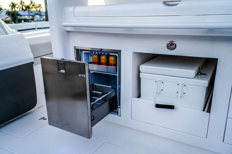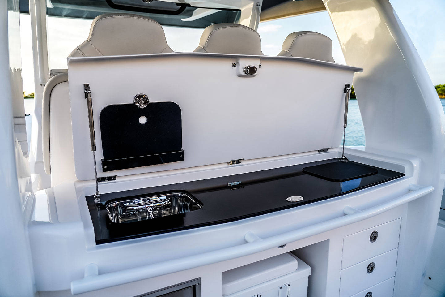 The spacious hideaway head features a vanity and sink, with ample storage for toiletries and towels. The infinitely customizable cockpit accommodates an optional grill station and sink, along with our signature Intrepid swing-in, hull side dive door with a fold-out ladder. An incredible amount of ingeniously integrated storage space includes options for rod lockers, tackle stations, fish boxes, above-deck lighted bait wells, dive tank racks, fender storage compartments, and more. Your choice of refrigerators, ice makers, coolers, and electronics invite you to customize the boat of your dreams.