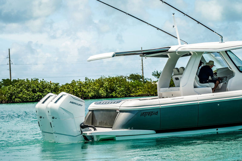 7 Hull side dive door, an Intrepid trademark, with our latest lift up/rotate design that doesn’t take up valuable cockpit space while in the open position. And, it also allows for easy dockside boarding.