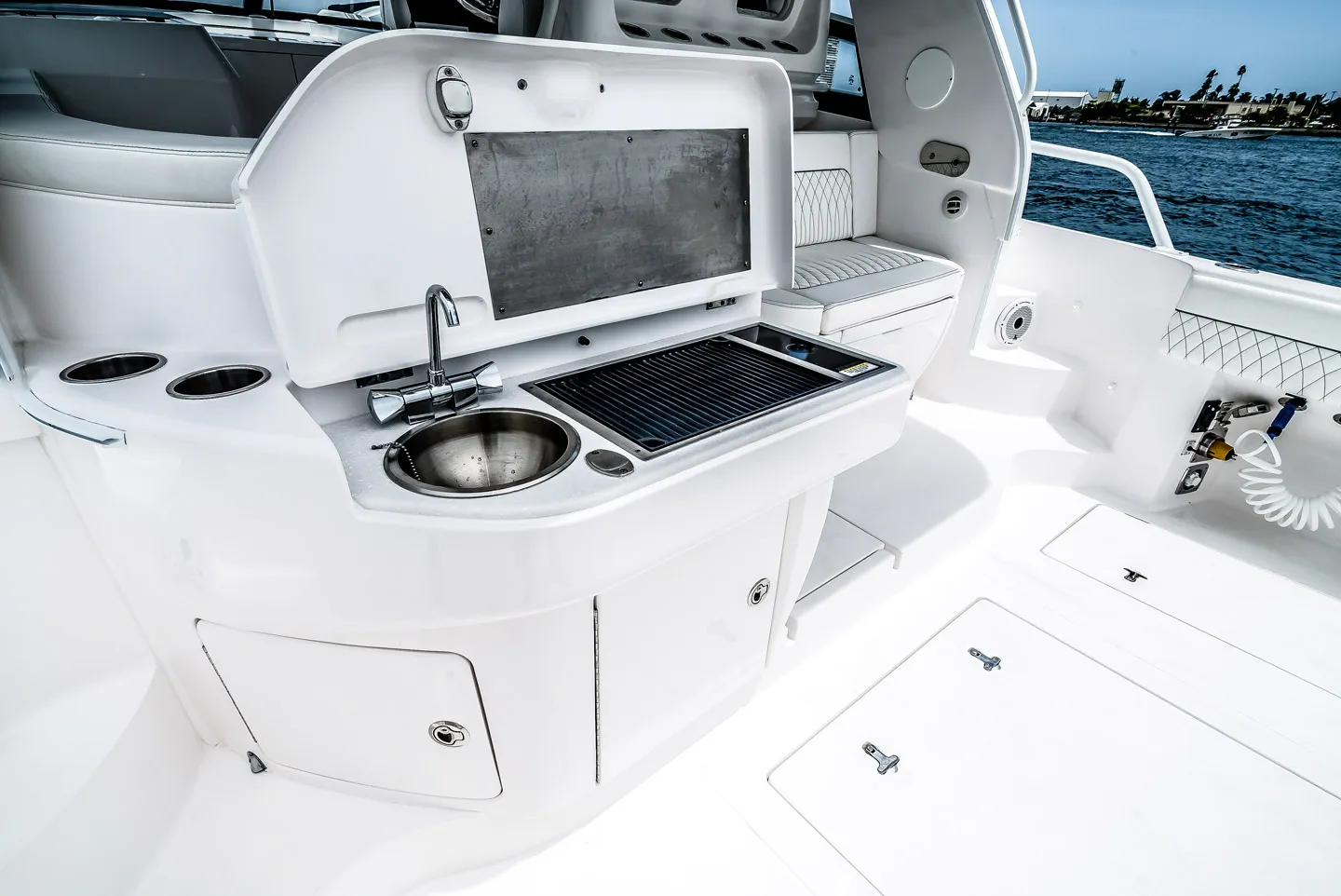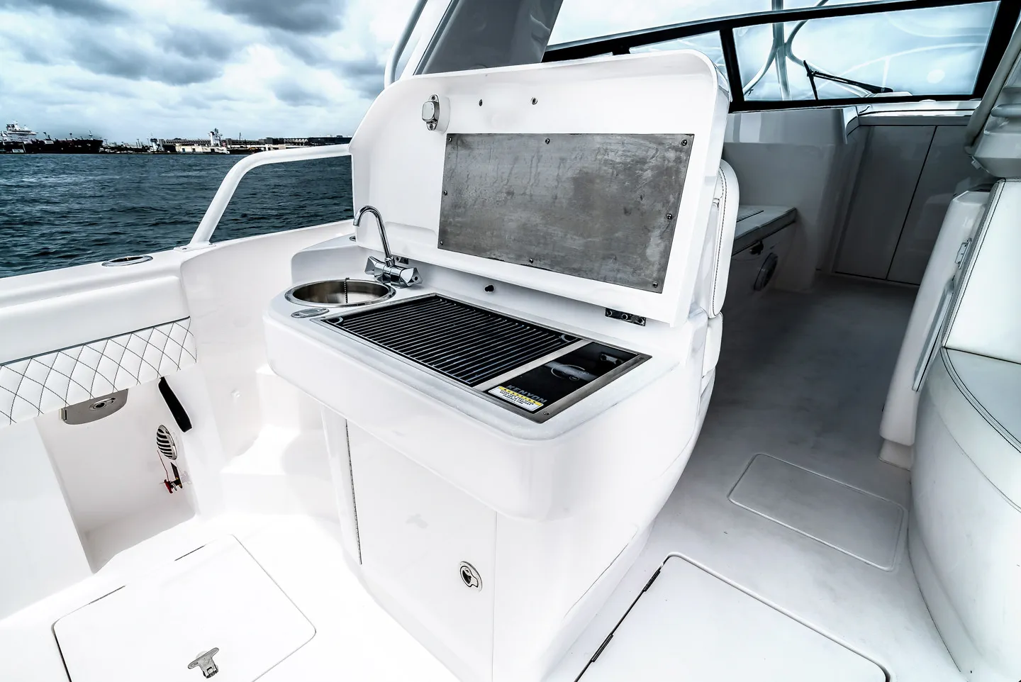 A cabin twice as large as an inboard of similar size? Heard. A racy, big water day boat for short hops? Heard again. And complete, world-class amenities befitting a luxury yacht so you can hit the islands for a week at a time? Yes, we heard all of it.