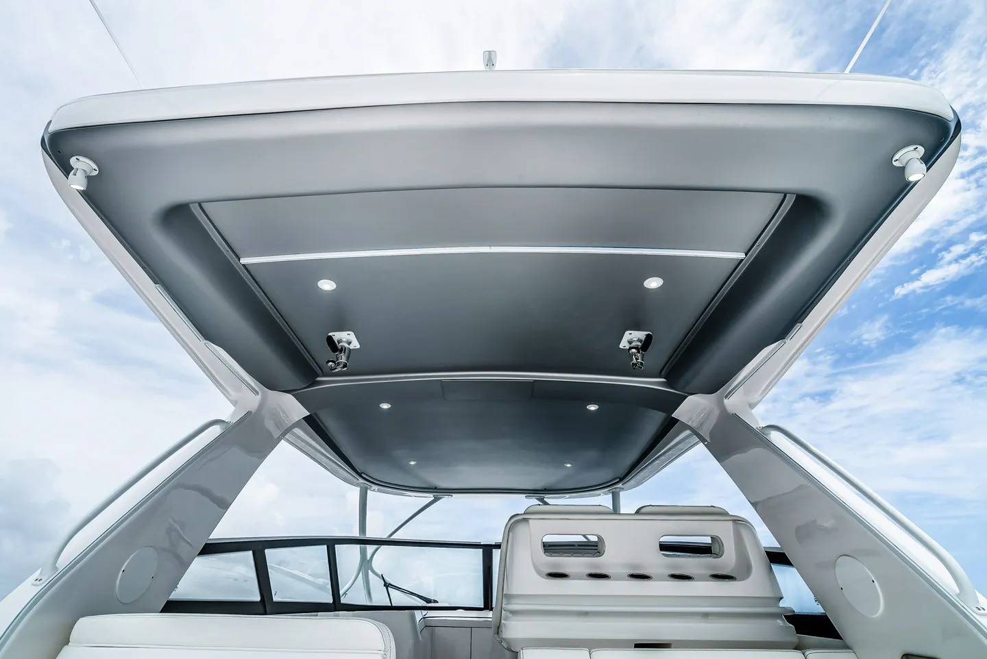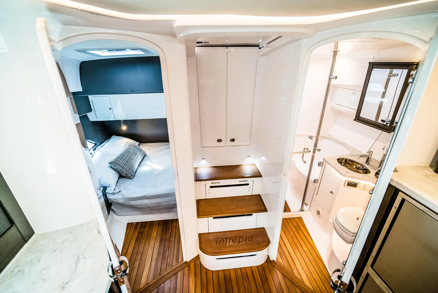 The 438 Evolution boasts a helm with a pop-up console equipped with the latest flat-screen electronics while an optional power sunroof overlooks wraparound club-style seating that inspires comfortable interaction. During the day, the state-of-the-art accommodations in the cabin are flooded with natural sunlight aboard this one of a kind sport yacht.