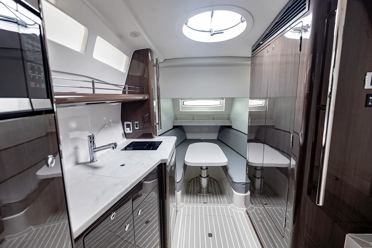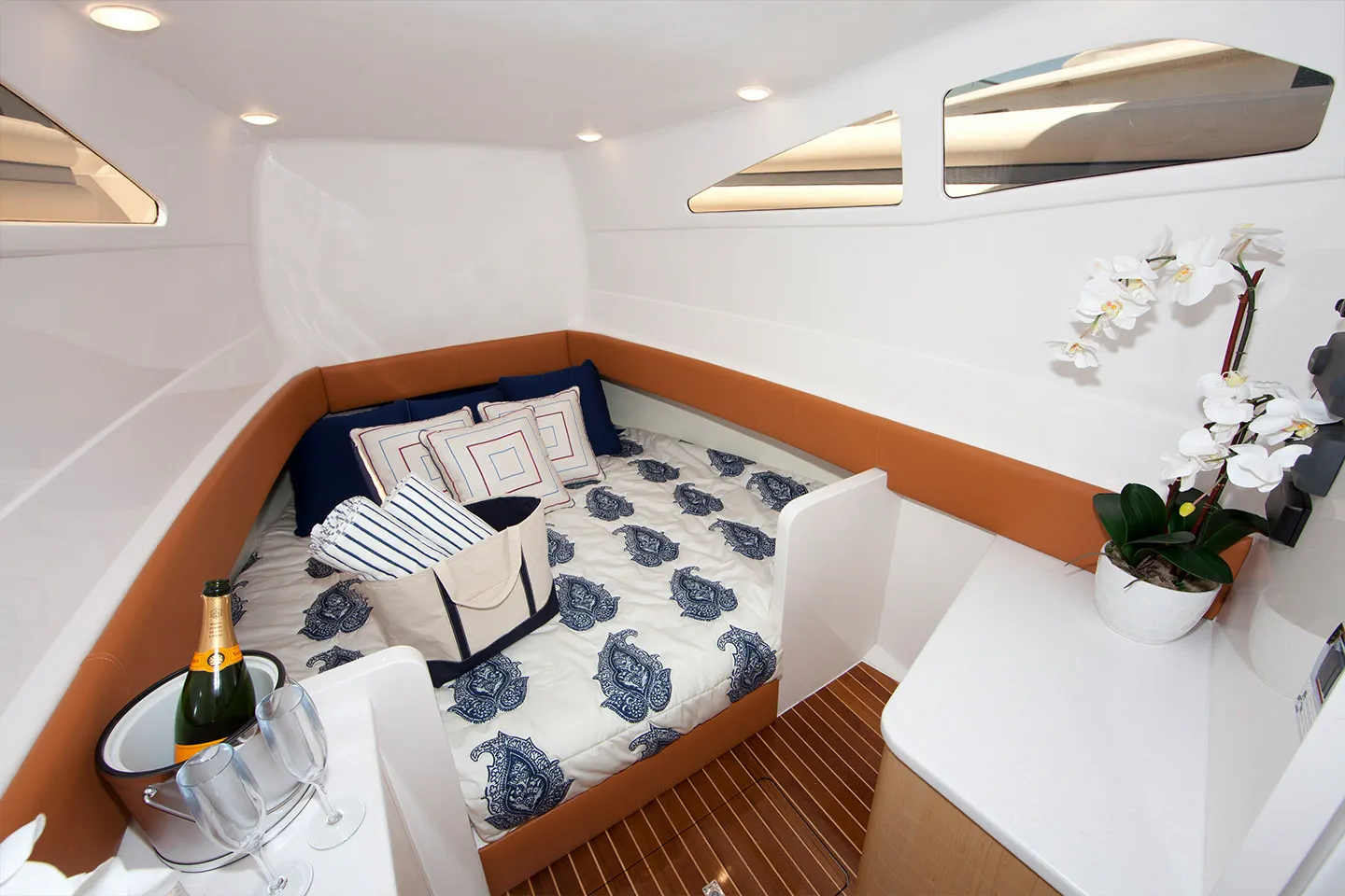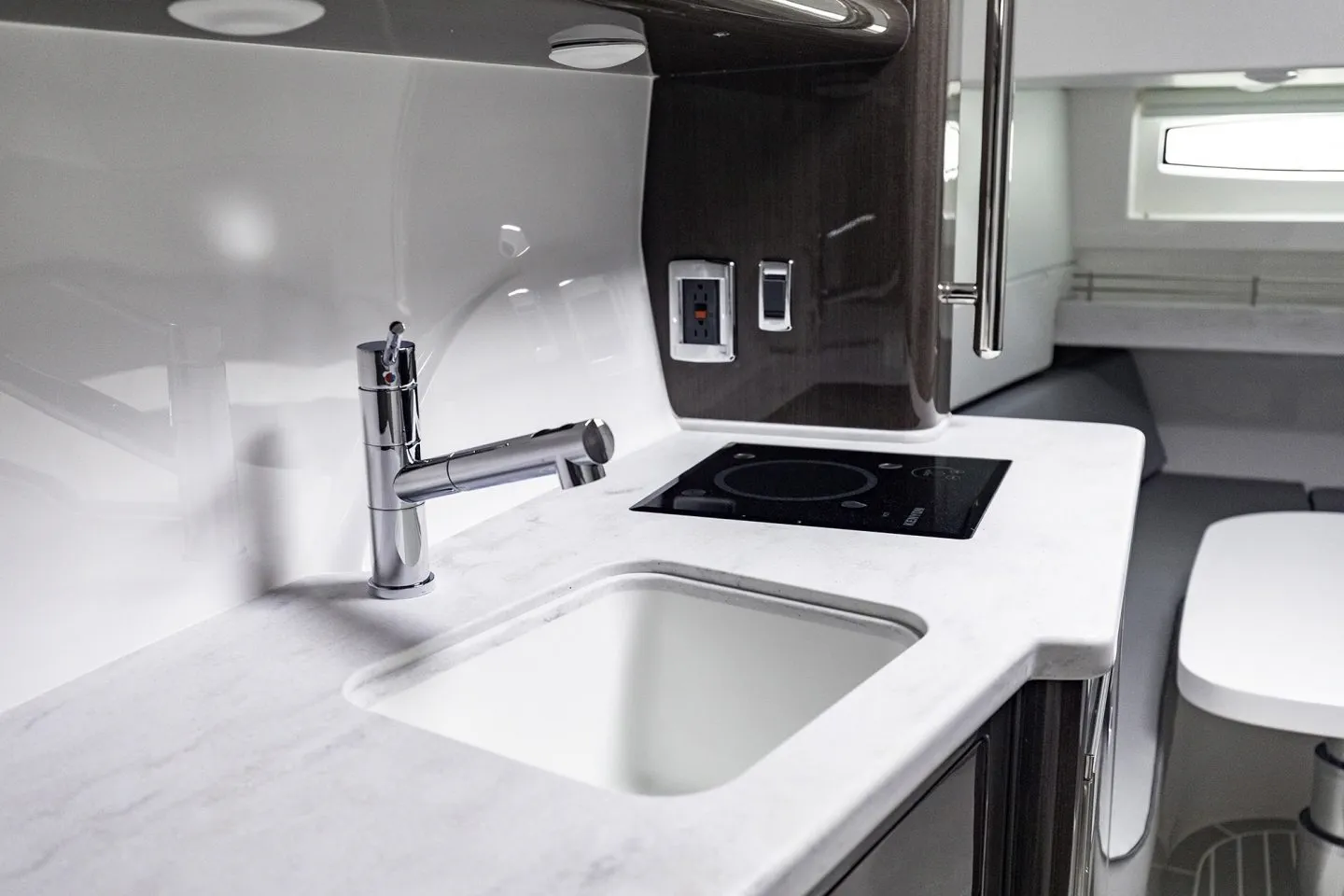 sink and high-end cabinetry and a spacious V-berth for luxurious accommodations.