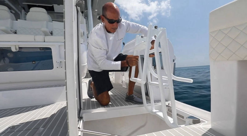 6 Fold-out ladder conveniently stows under the cabin sole and when deployed it allows for easy entry and exit from the water in through the hull side dive door.