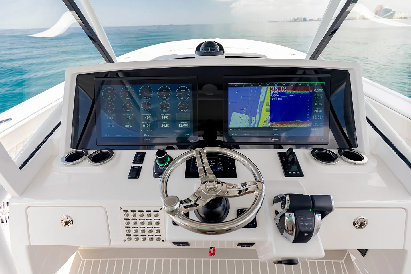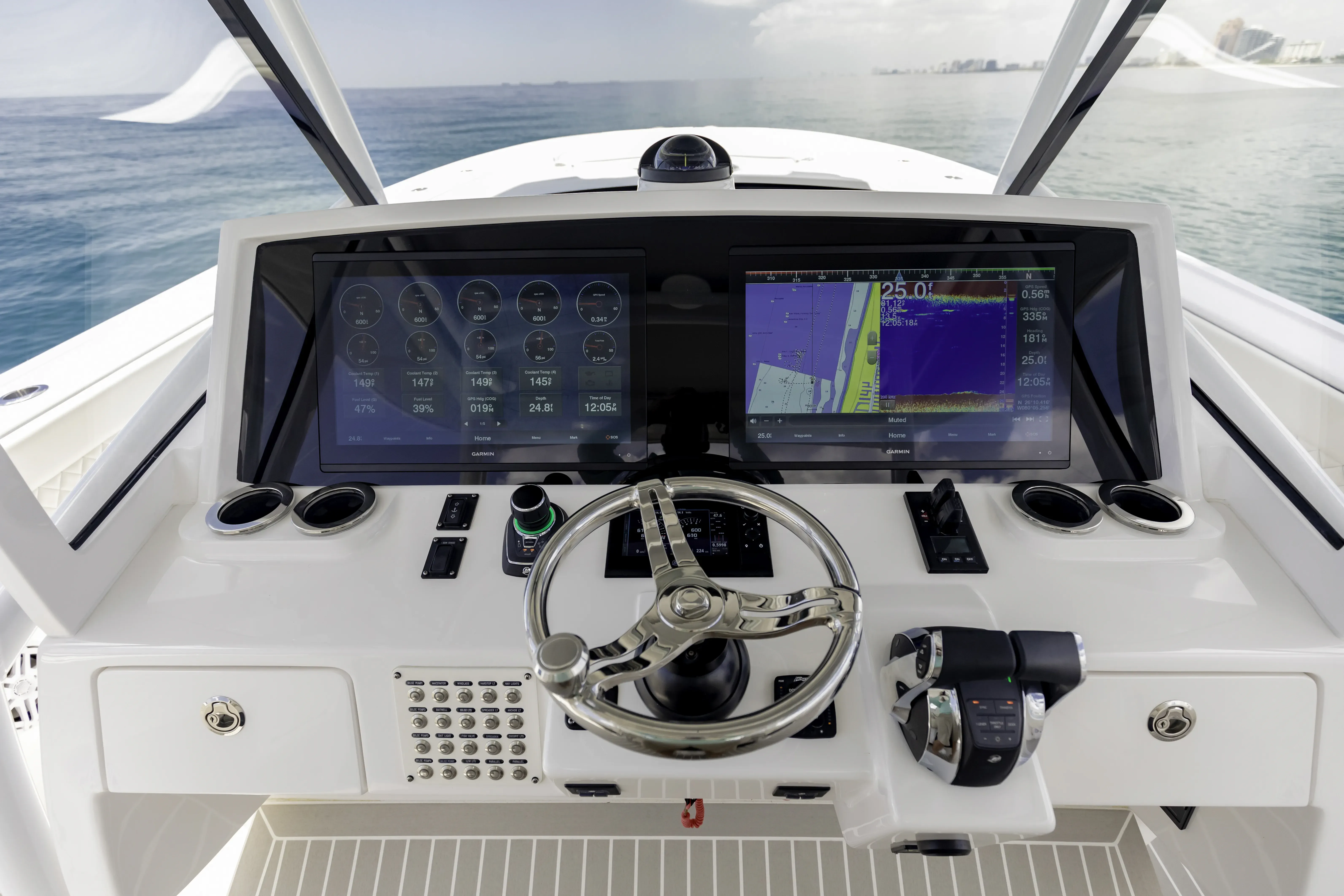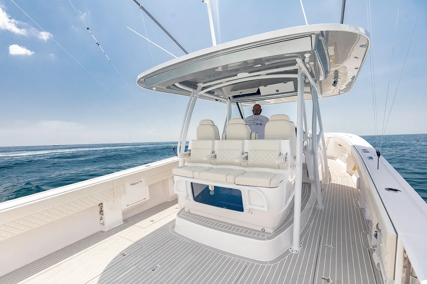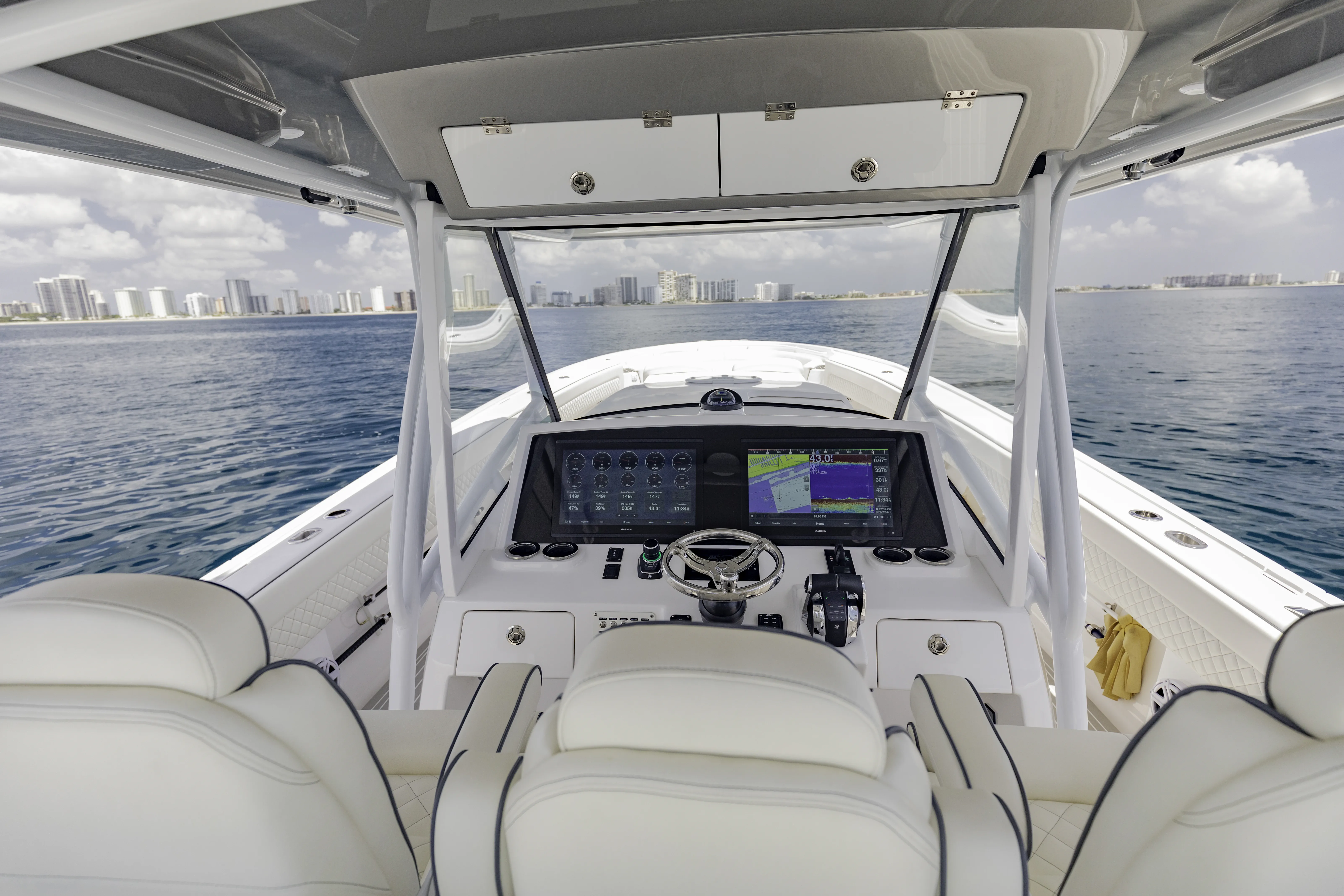 It’s perfectly crafted to battle a 400lb marlin. Or if you prefer to see one face to face, it’s ideal for diving into the depths below to experience them firsthand. The helm features a state-of-the-art platform for electronics, fold-down armrests, footrests, LED lighting and a convenient cooler. An expansive cockpit features rear seating, fish boxes and storage lockers.