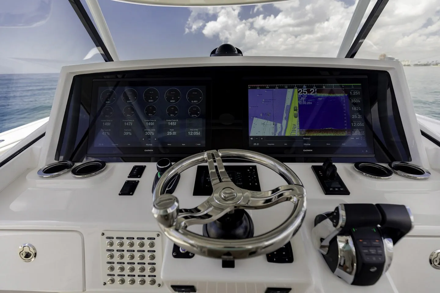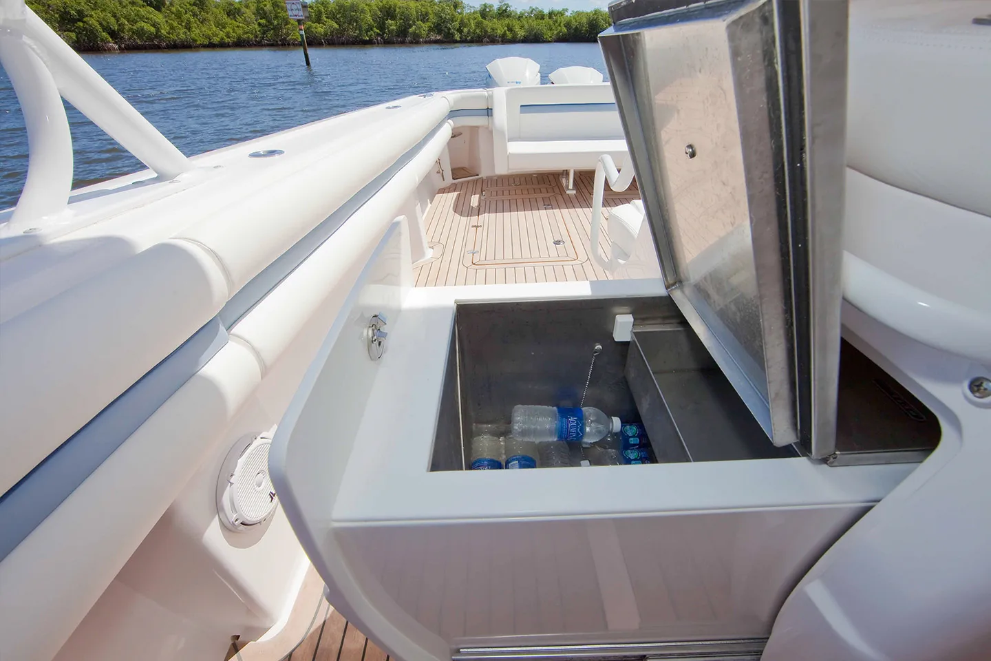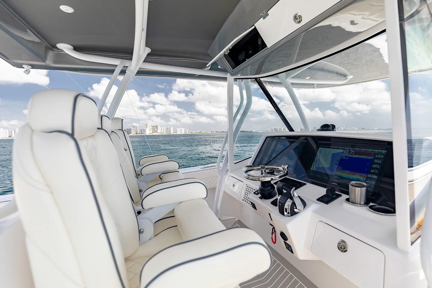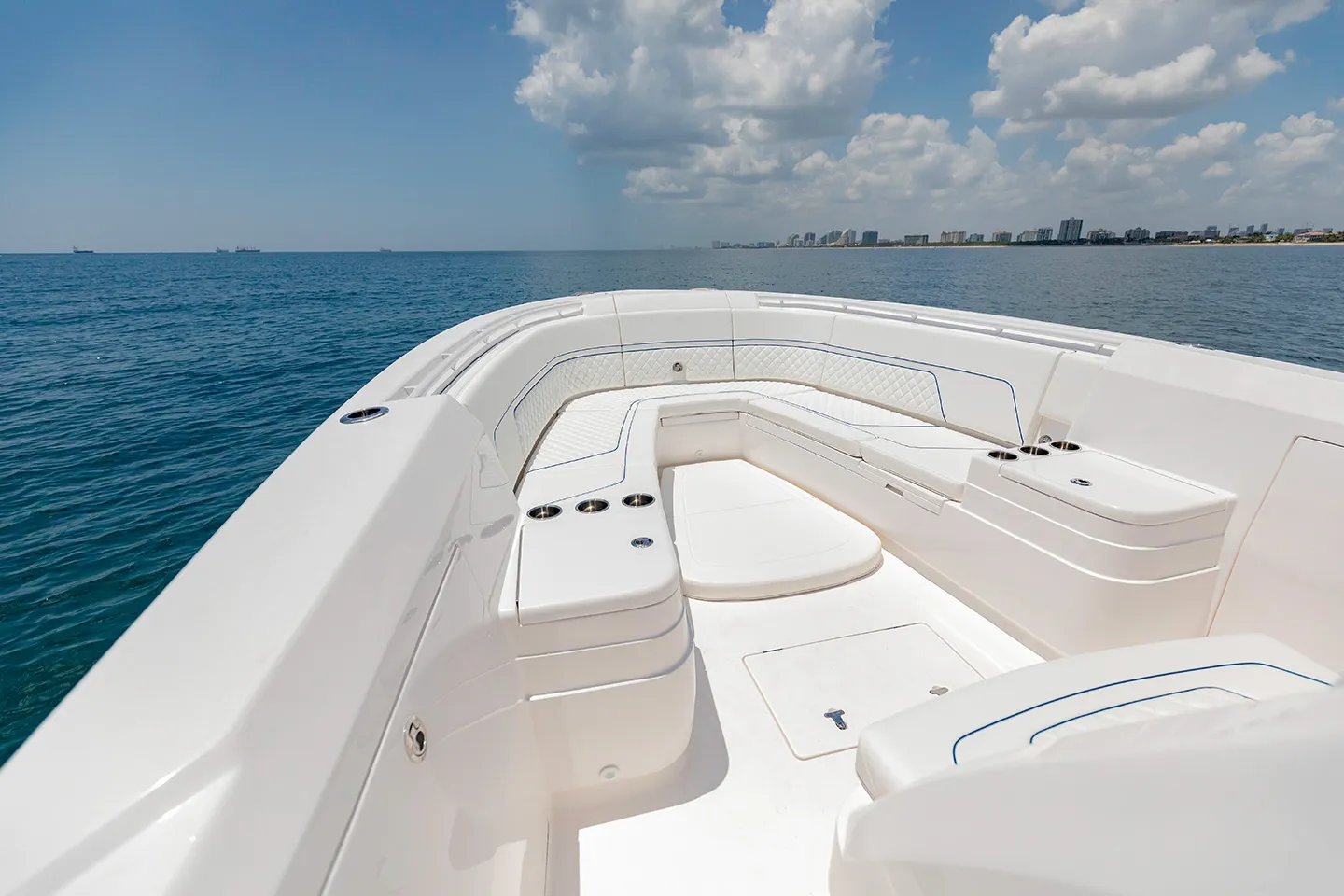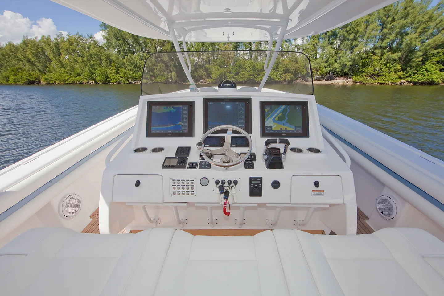 It’s perfectly crafted to battle a 400lb marlin. Or if you prefer to see one face to face, it’s ideal for diving into the depths below to experience them firsthand. The helm features a state-of-the-art platform for electronics, fold-down armrests, footrests, LED lighting and a convenient cooler. An expansive cockpit features rear seating, fish boxes and storage lockers.
