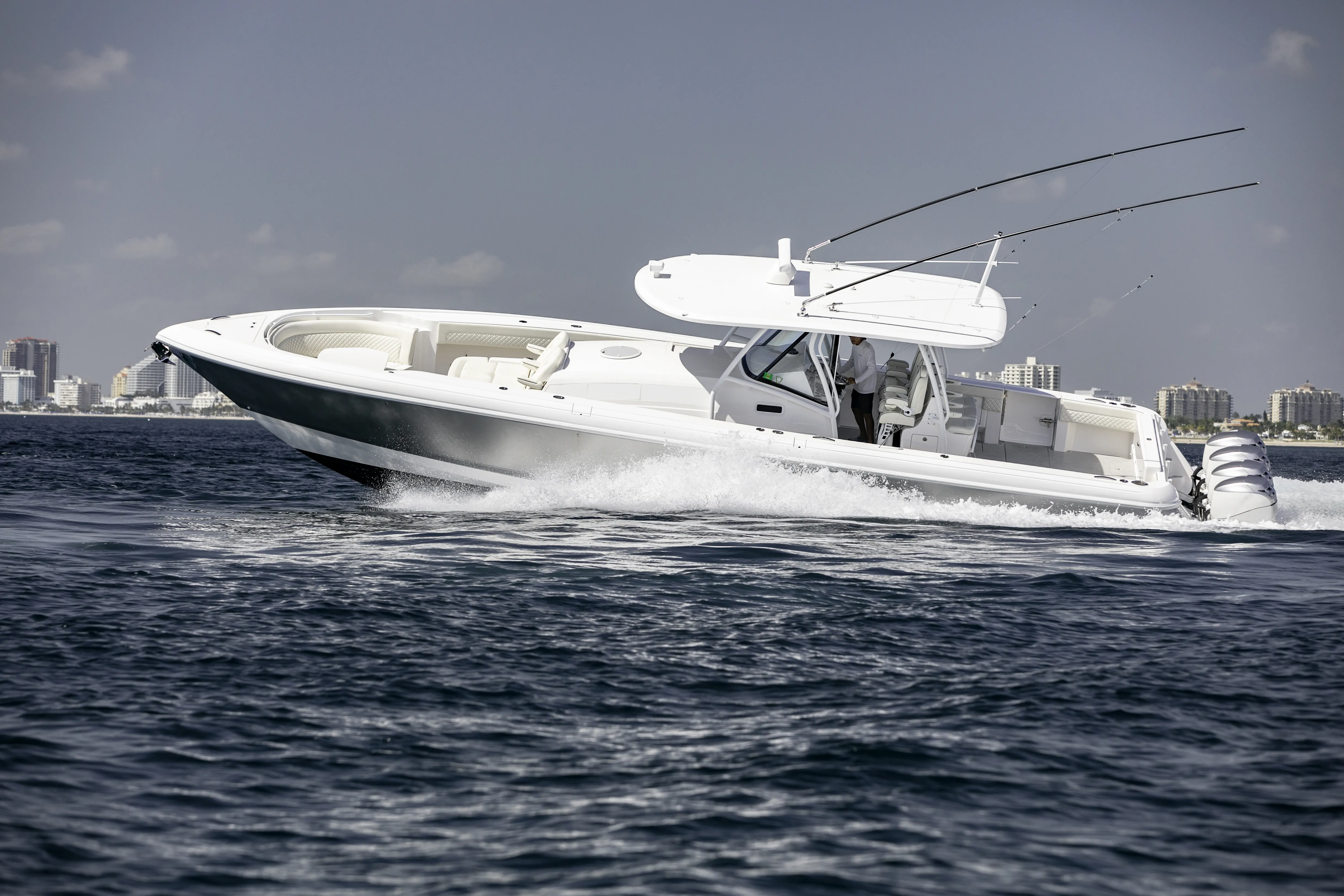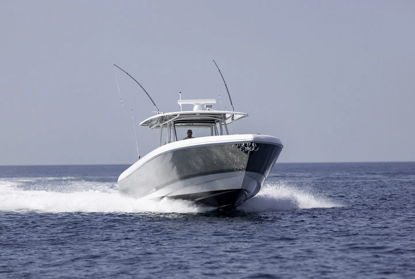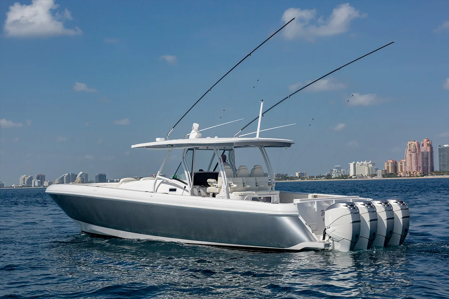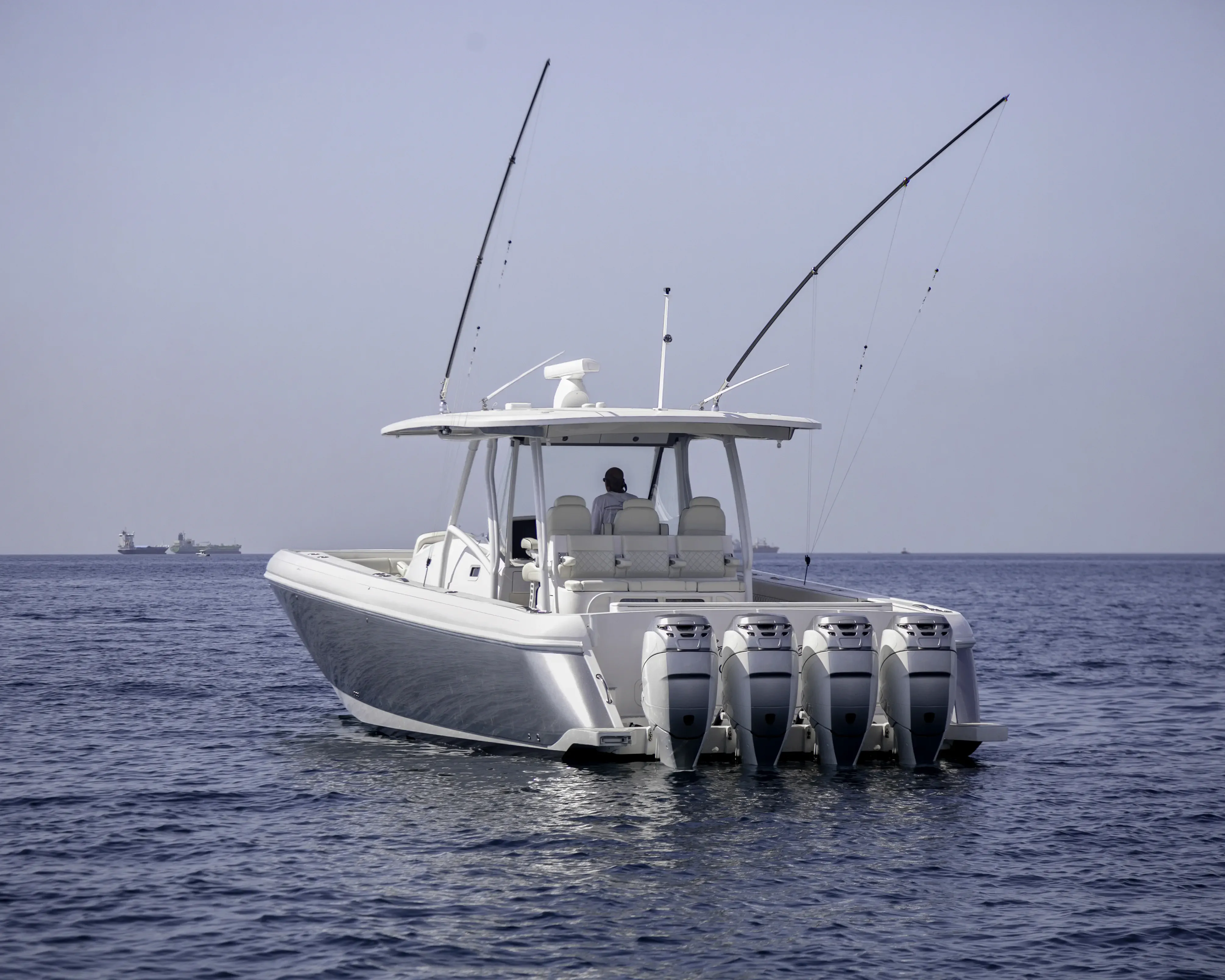 It is a wave-crushing offshore machine that handles both fishing and cruising with luxury and style. Power choices include either triple or quad outboard engines. The 475 Panacea’s signature transverse-stepped hull is designed to maximize fuel efficiency and stability. Effectively creating two separate hulls, the boat is supported on the plane at twice as many points as conventional hulls, providing a smooth, dry ride. Bow rise is minimized, pitching and heeling are reduced, and range is significantly increased.