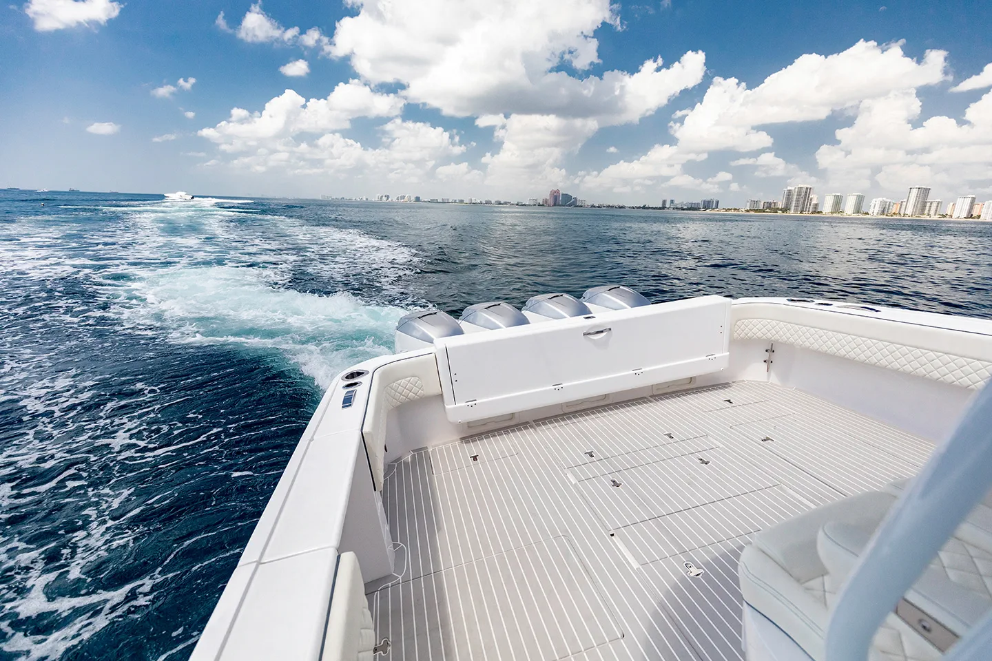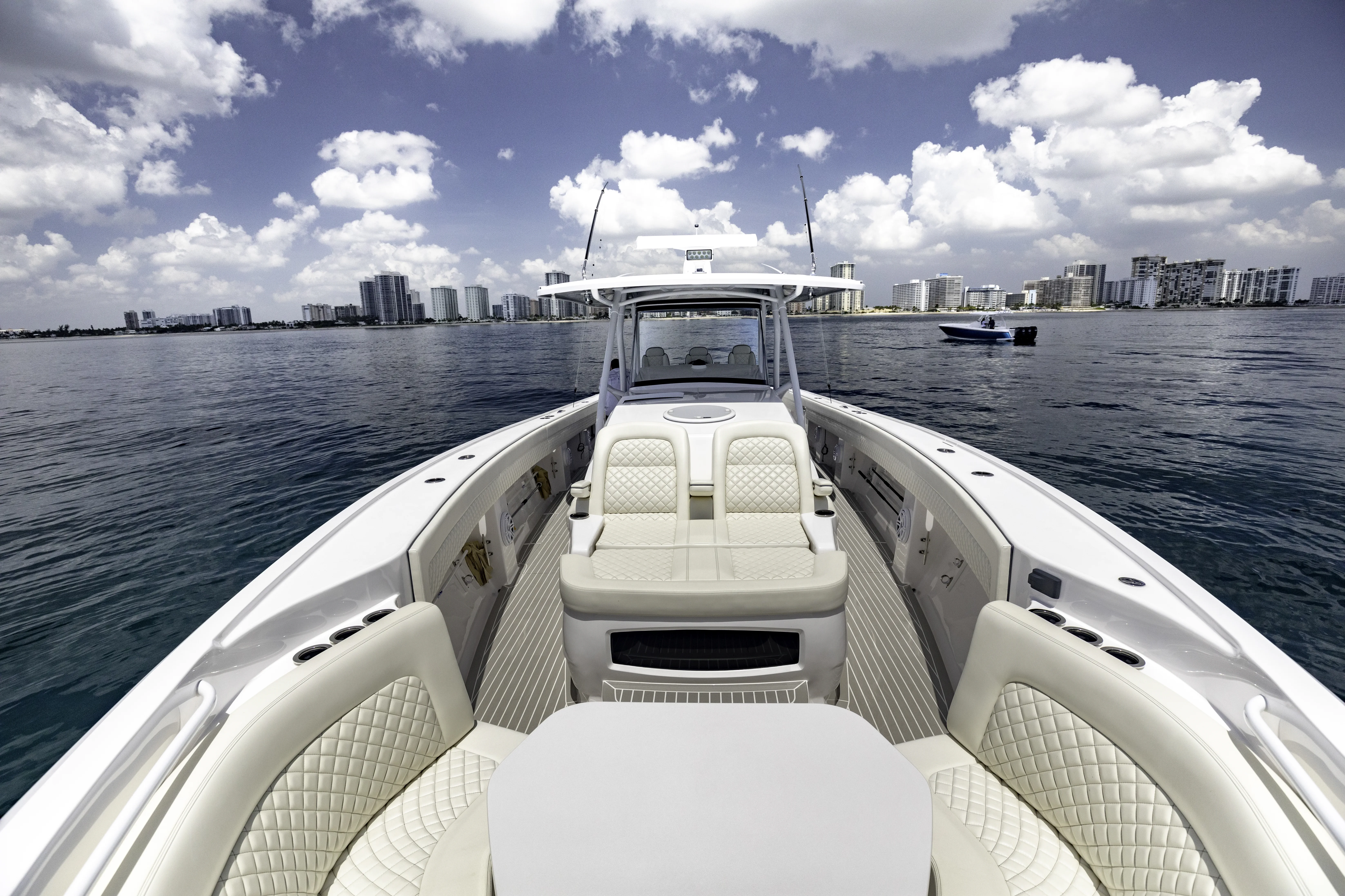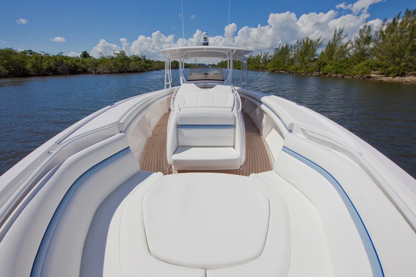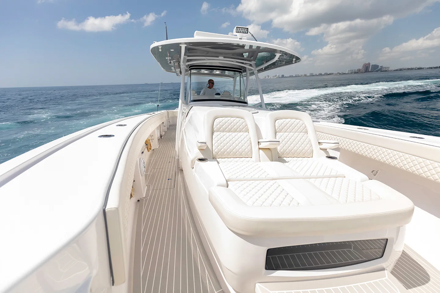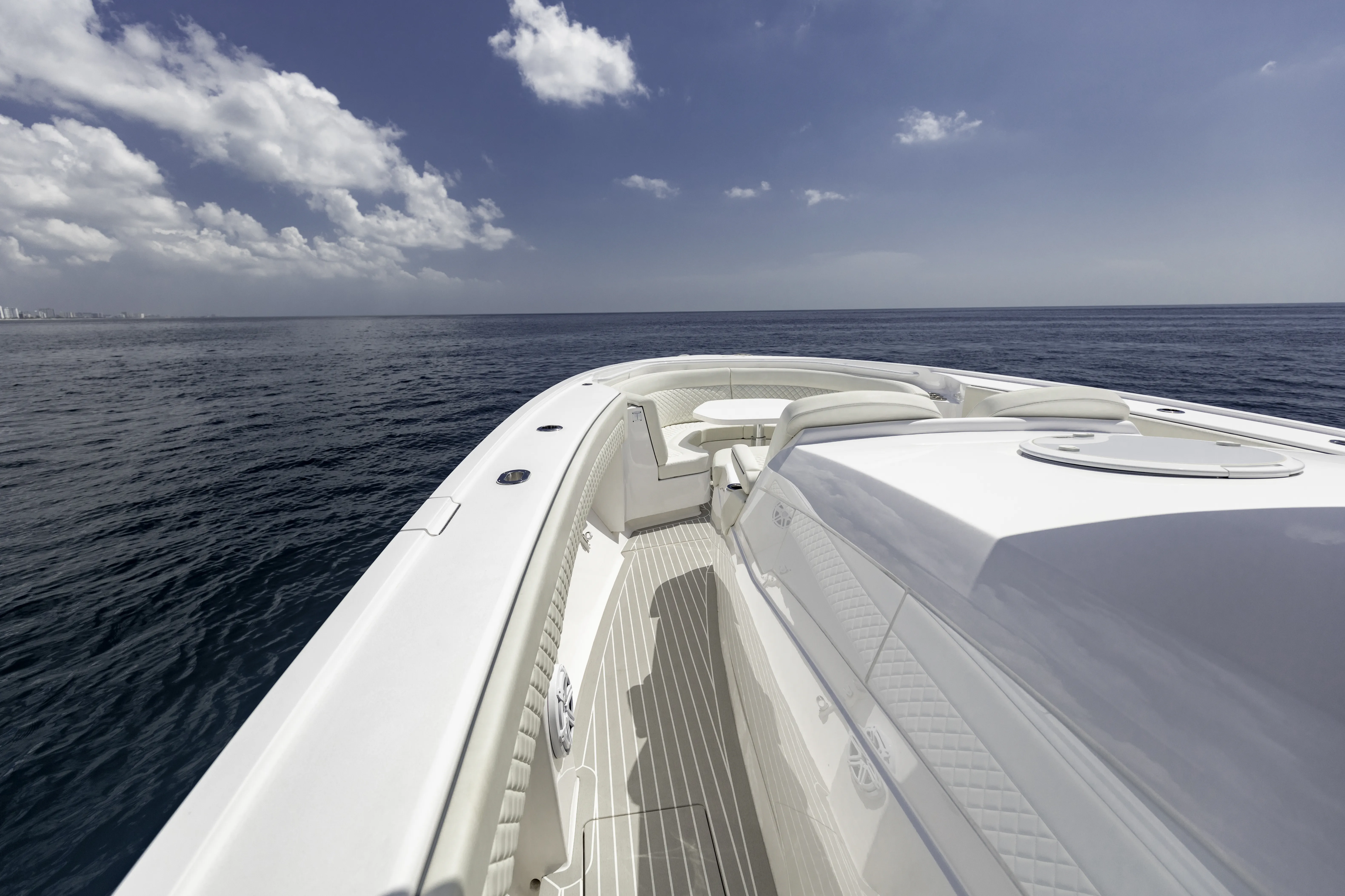 The 475 Panacea weighs approximately 28,000 pounds—depending upon the power package—which flattens waves while being surefooted enough to maintain speed and comfort when other boats are throttling back. The Panacea’s helm features a state-of-the-art platform for electronics, fold-down armrests, footrests, LED lighting, and a convenient cooler. An expansive cockpit features rear seating and fish boxes/storage lockers. An oversized sun pad and wraparound forward seating create a versatile VIP lounge that converts to an alfresco dining area.