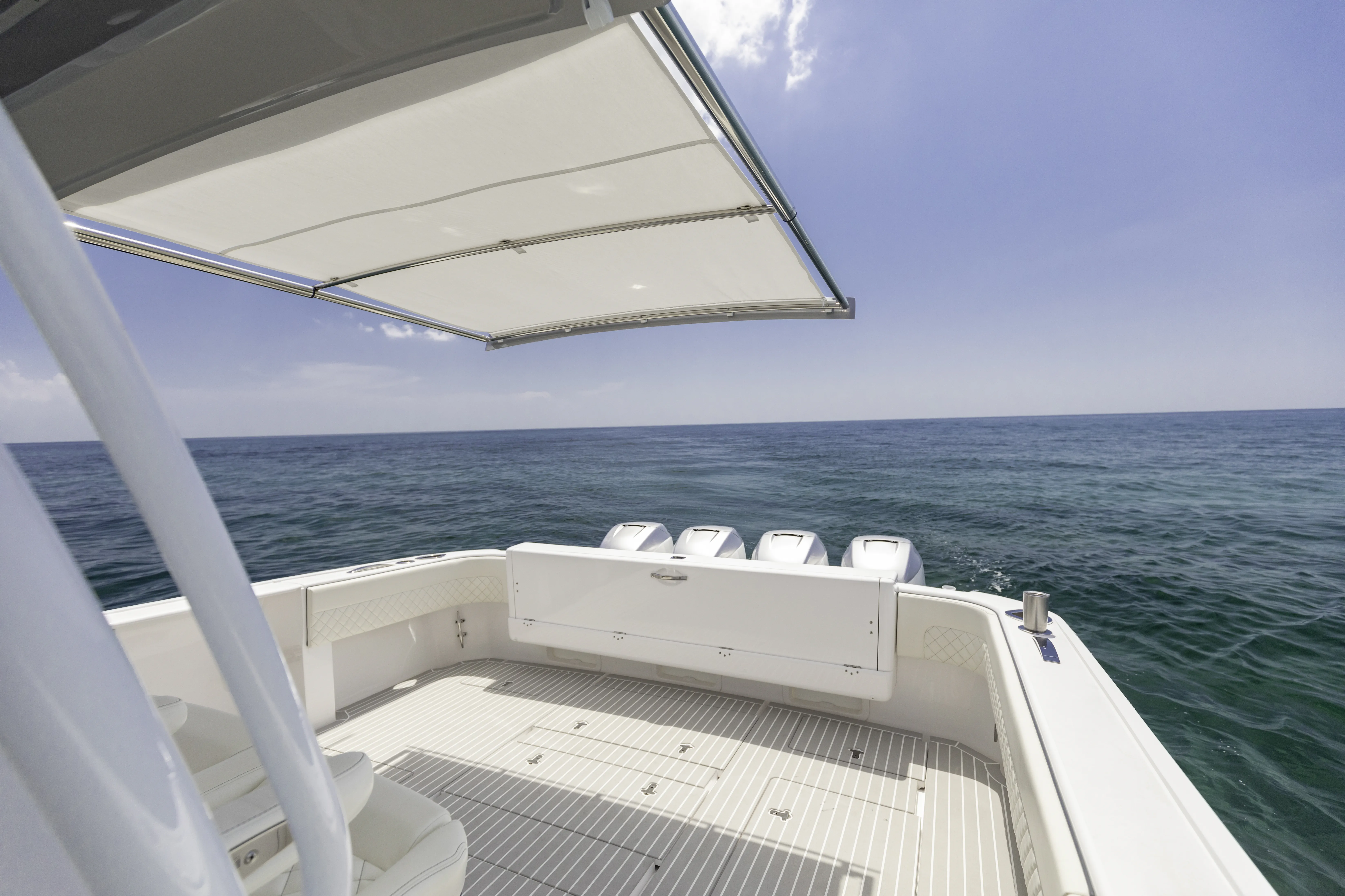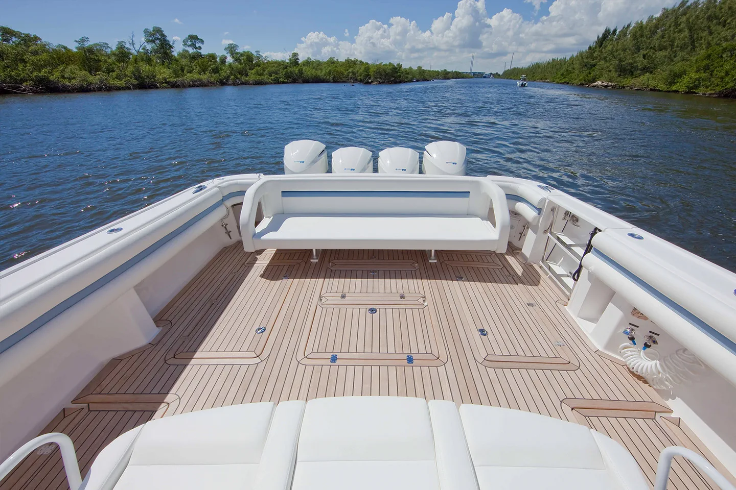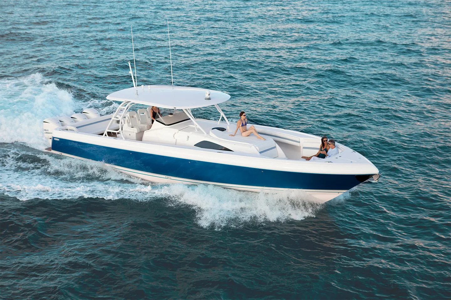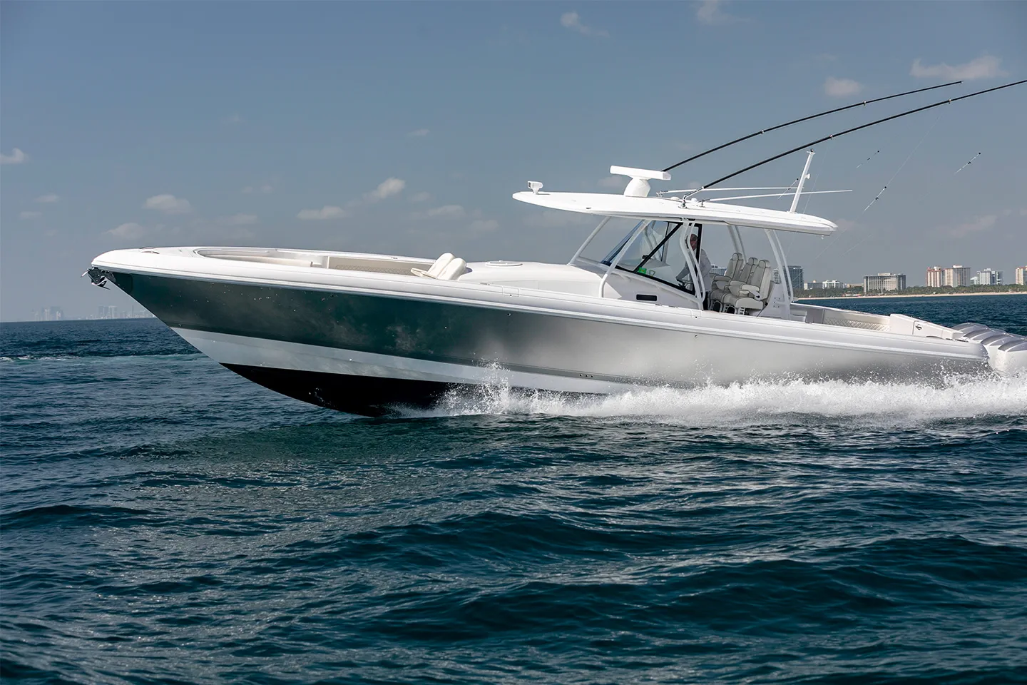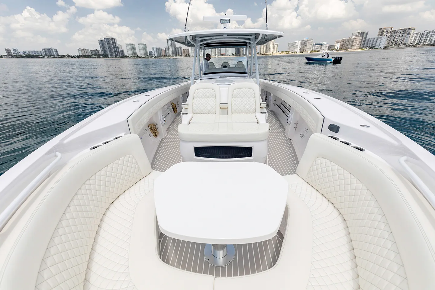 The 475 Panacea weighs approximately 28,000 pounds—depending upon the power package—which flattens waves while being surefooted enough to maintain speed and comfort when other boats are throttling back. The Panacea’s helm features a state-of-the-art platform for electronics, fold-down armrests, footrests, LED lighting, and a convenient cooler. An expansive cockpit features rear seating and fish boxes/storage lockers. An oversized sun pad and wraparound forward seating create a versatile VIP lounge that converts to an alfresco dining area.