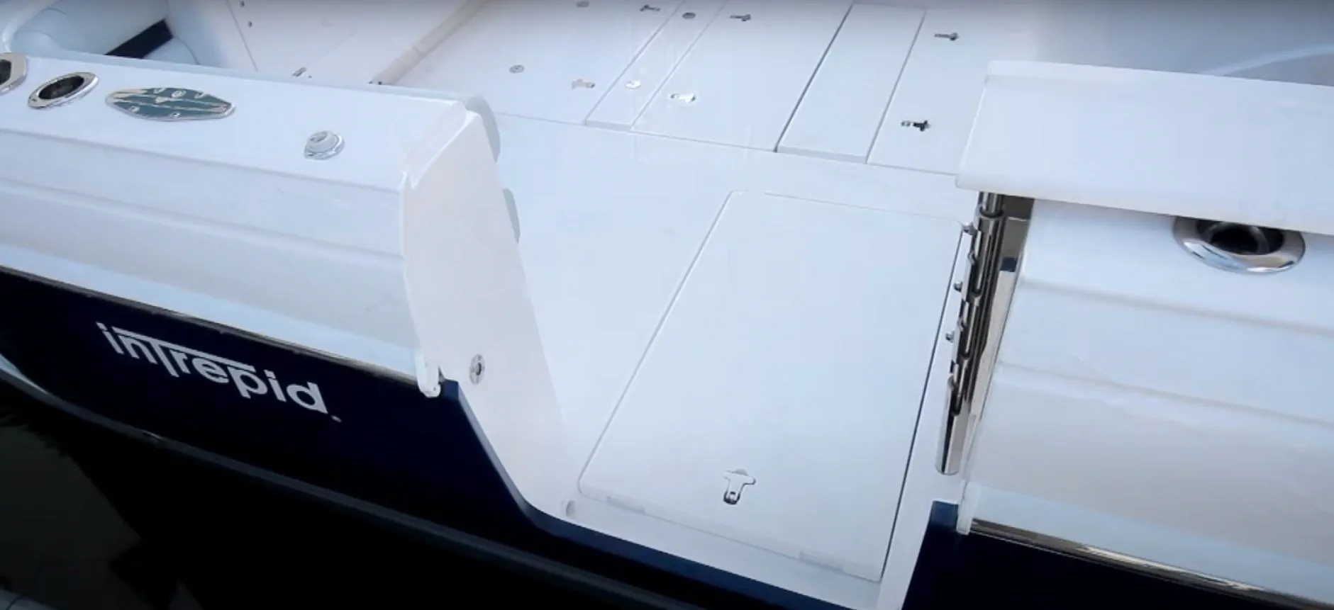 5 Hull side dive door, an Intrepid trademark, with our latest lift up/rotate design that doesn’t take up valuable cockpit space while in the open position. And, it also allows for easy dockside boarding.