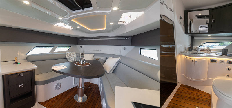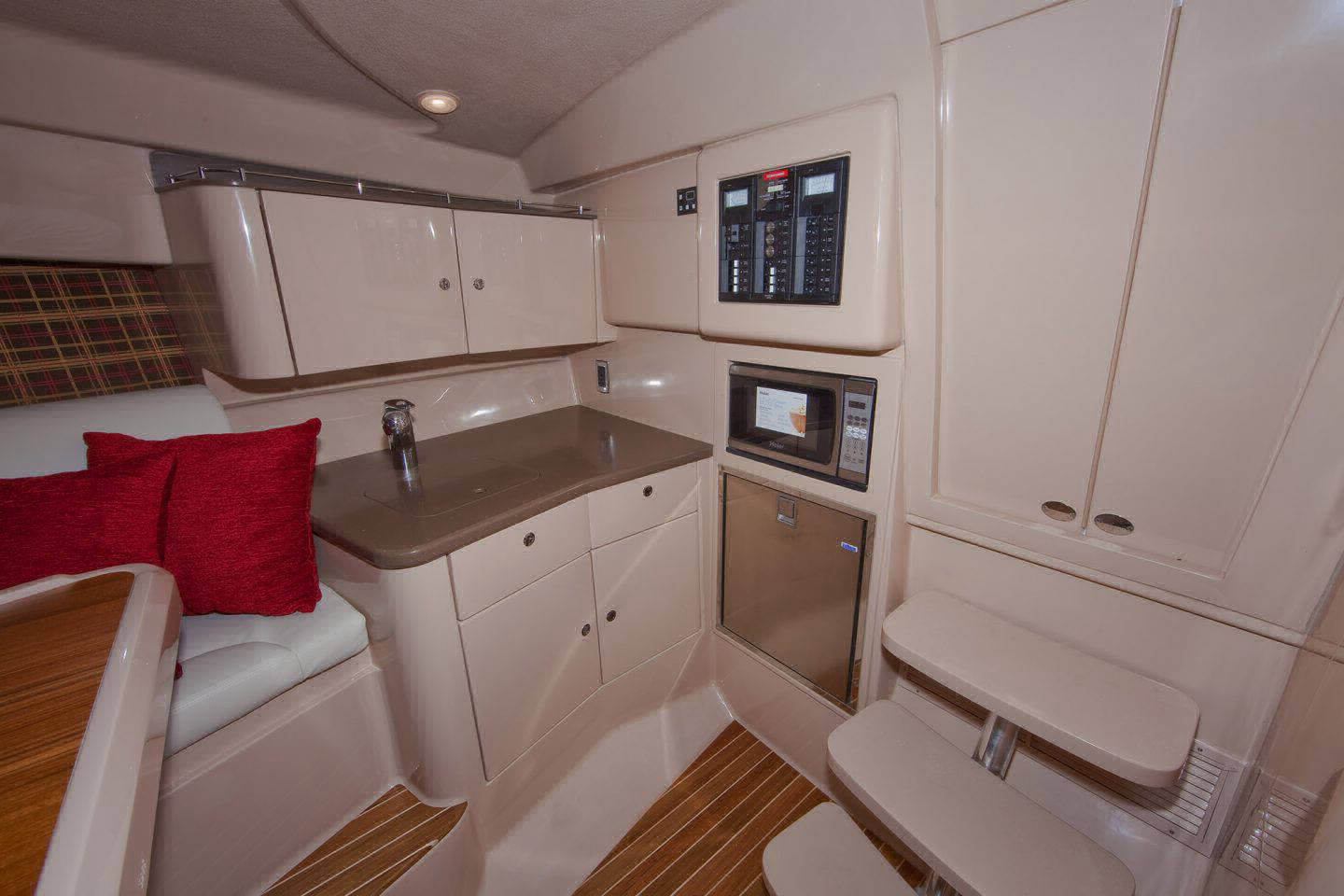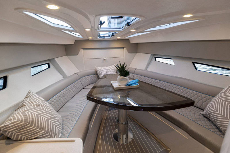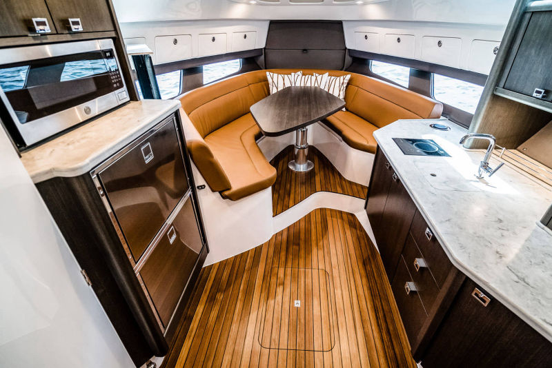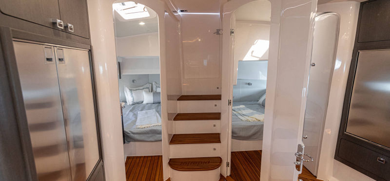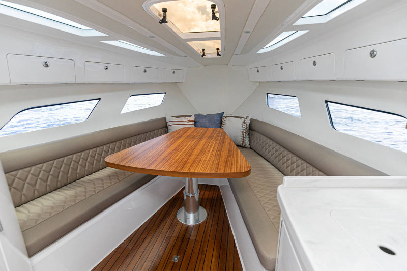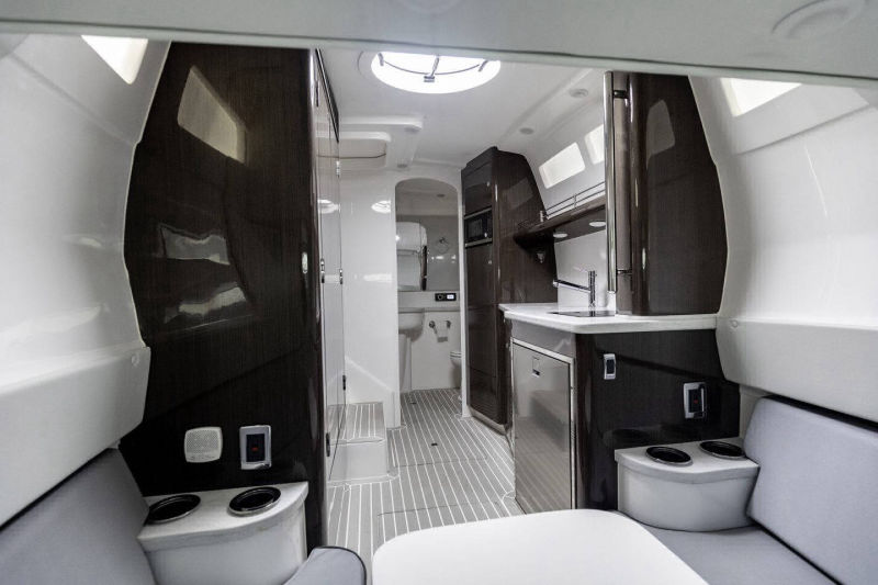 Wraparound forward seating creates a VIP lounge that converts to an alfresco dining area. Below, you’ll find a roomy head with a shower, vanity and sink, a galley with hard surface countertops, refrigerator, sink and high-end cabinetry and a spacious V-berth for luxurious accommodations.