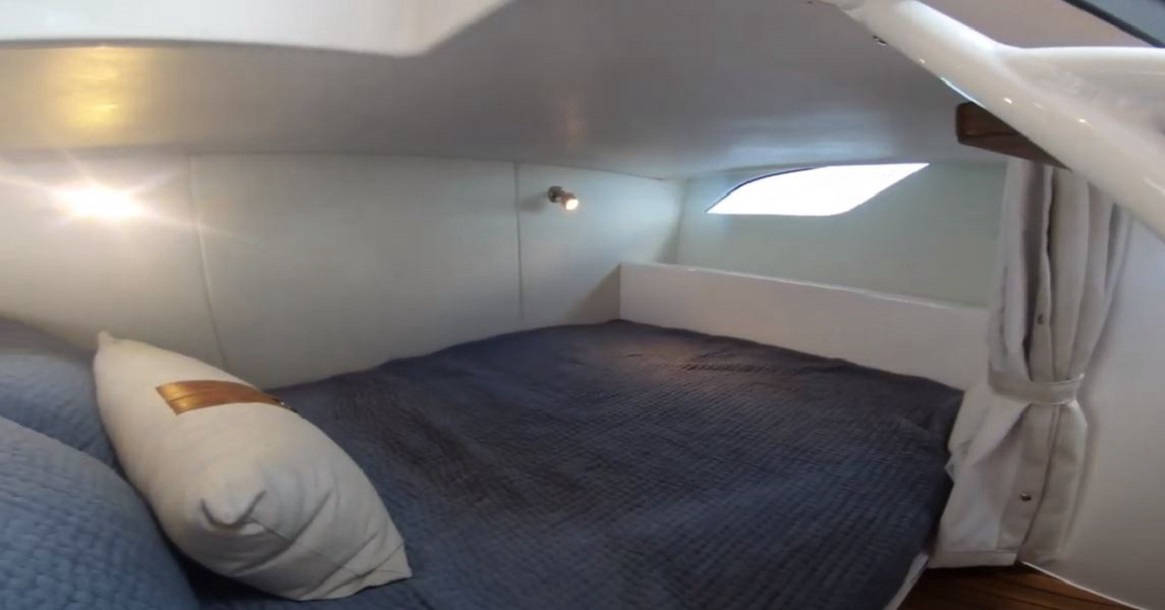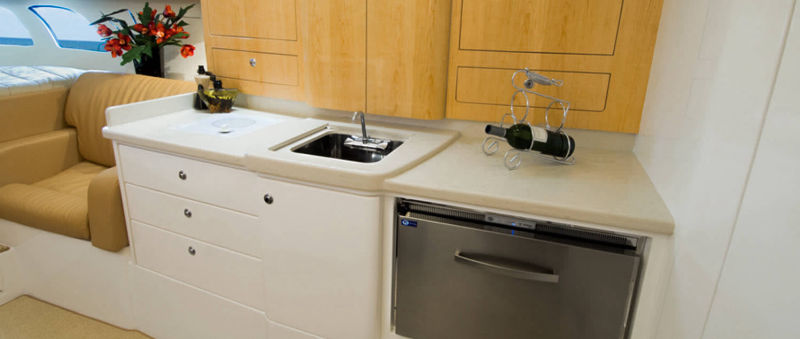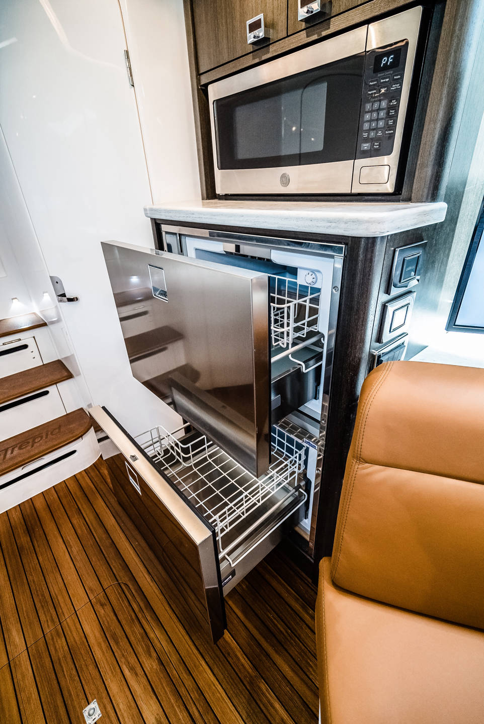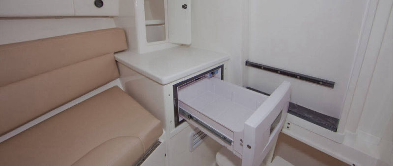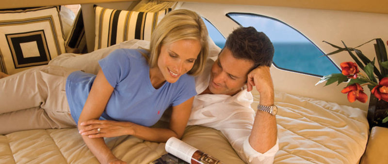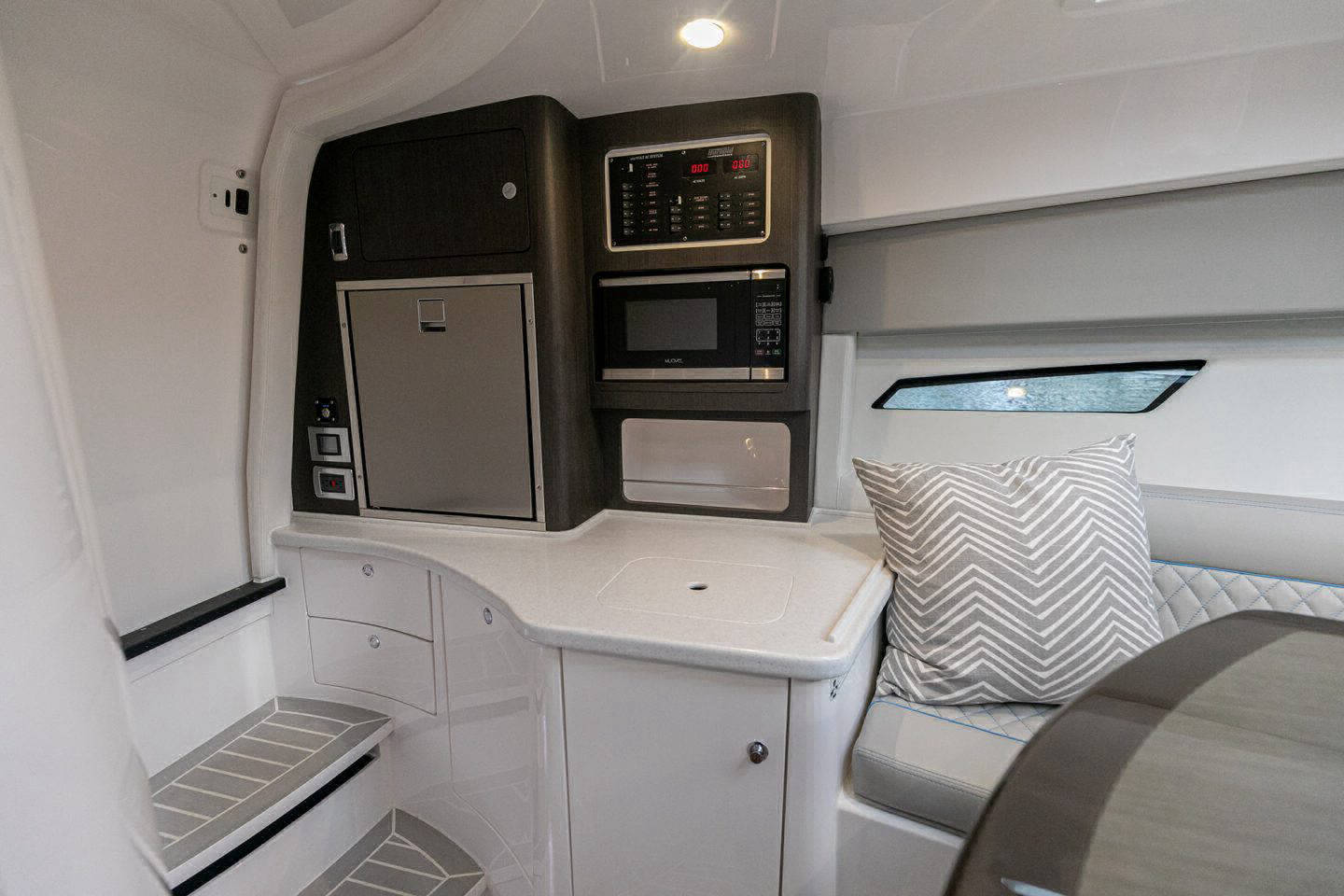 Wraparound forward seating creates a VIP lounge that converts to an alfresco dining area. Below, you’ll find a roomy head with a shower, vanity and sink, a galley with hard surface countertops, refrigerator, sink and high-end cabinetry and a spacious V-berth for luxurious accommodations.