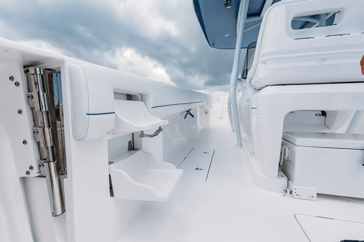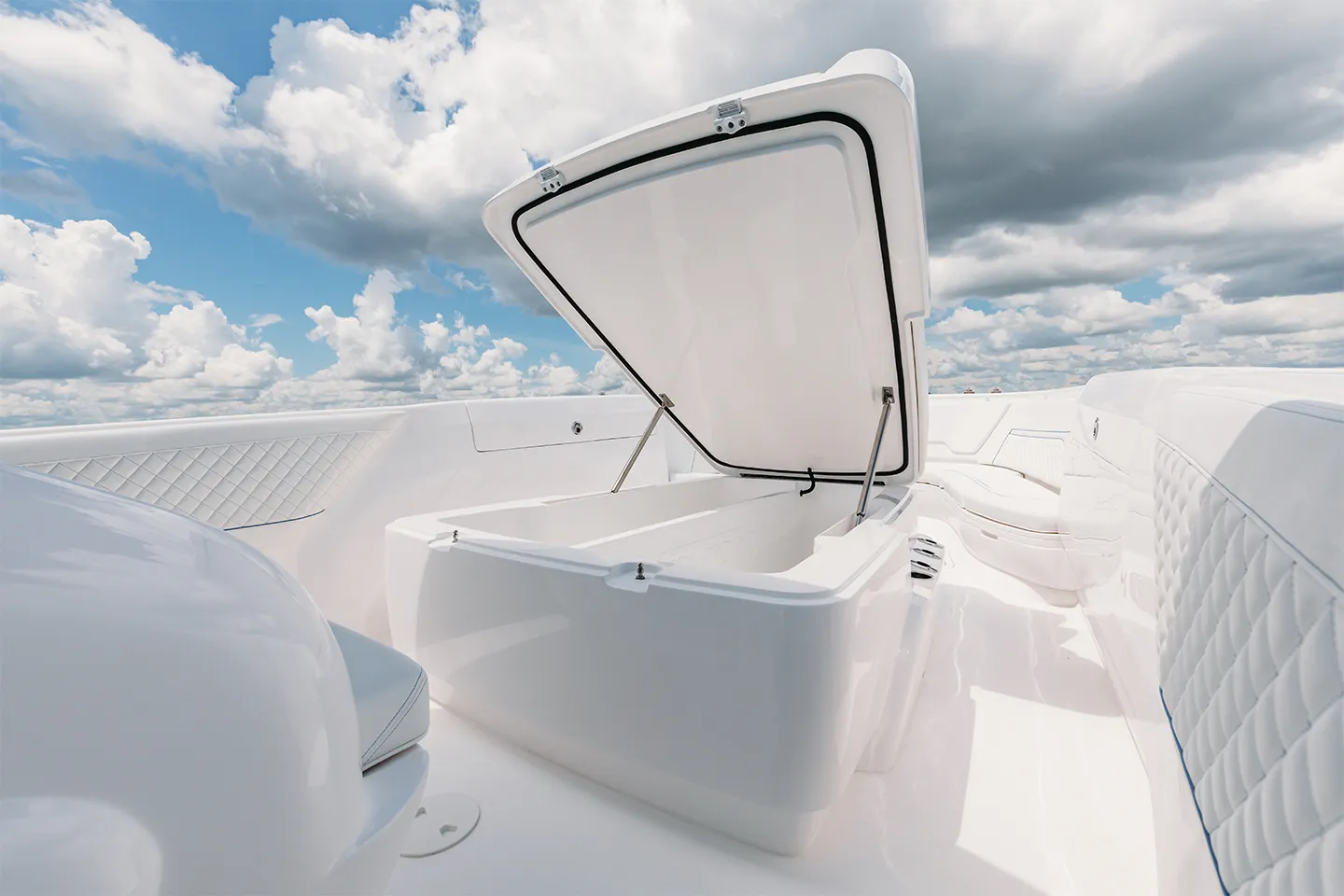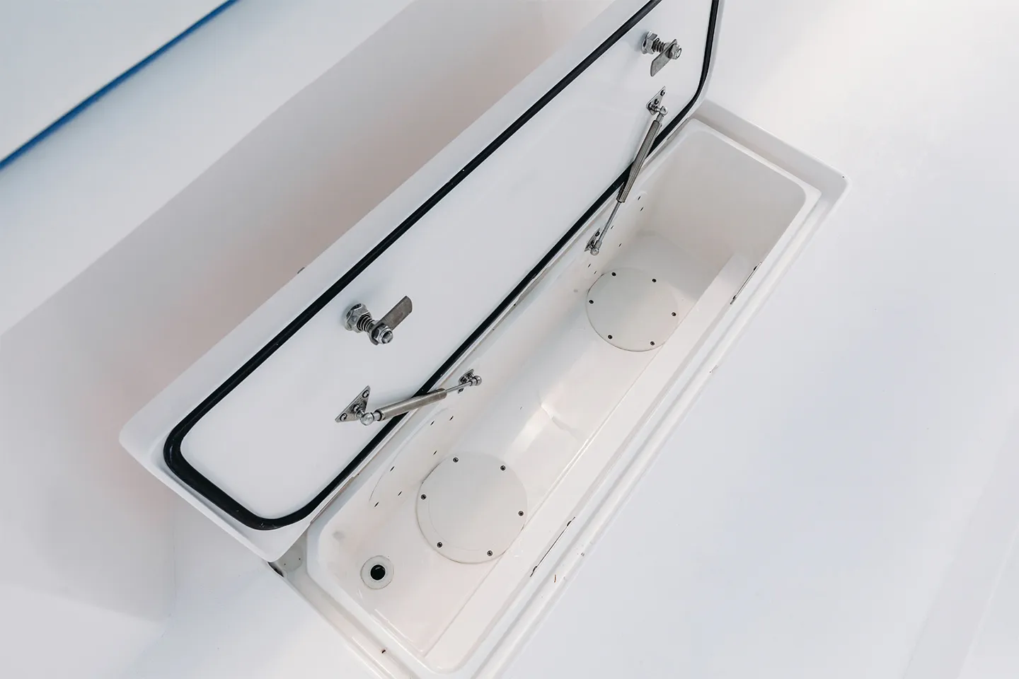 4 Port and Starboard aft above deck storage or optional rigged baitwells with windows makes fishing this aft cockpit more convenient and roomy by not stealing valuable cockpit space.