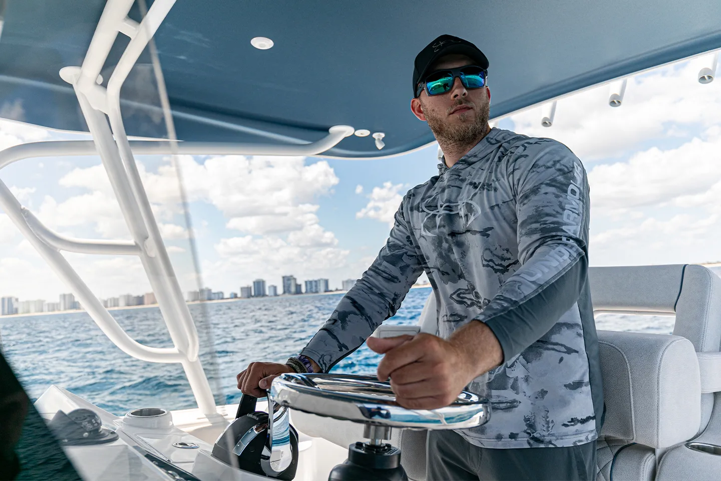 It is packed with thoughtful design features like a hull side dive door with a step ladder and grab rails for divers and swimmers. Entertaining is elevated with cozy, custom seating and a stylish wet bar. At the same time, serious sport fishermen will take note of the baitwells, rod holders, tank storage, tackle boxes and raw-water washdown.