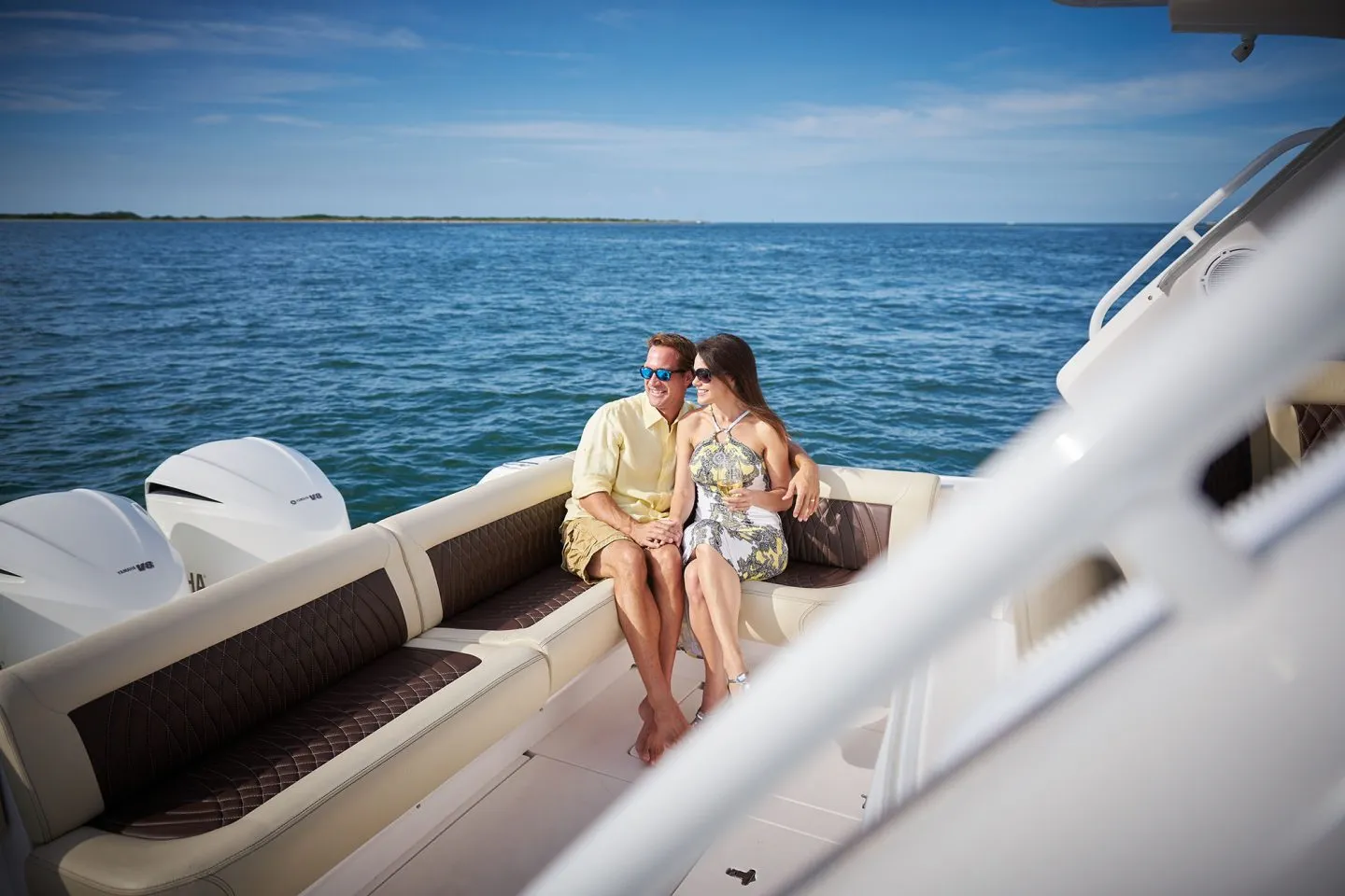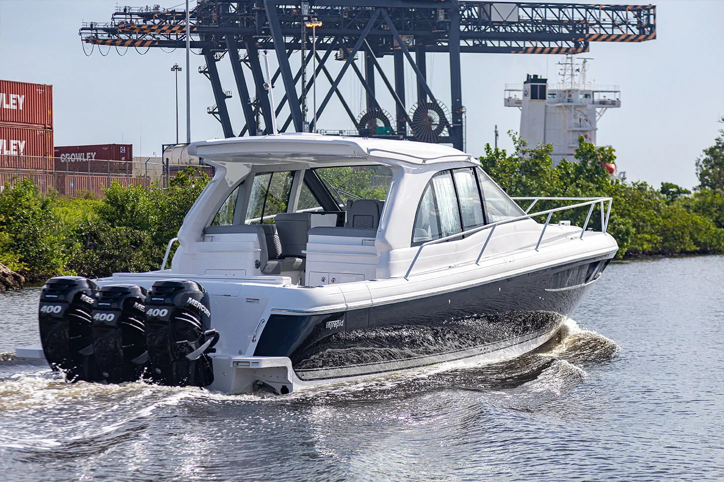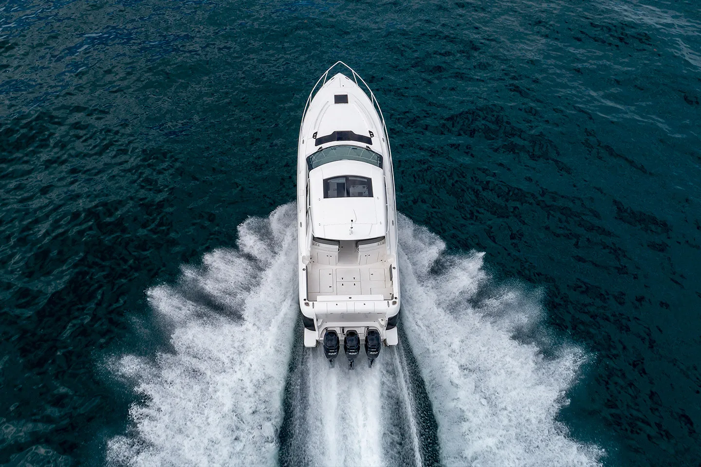 An exquisitely crafted byproduct of 30 years of evolution and 2 years of design, the 410 Evolution has pushed the class of high-end yachts to a new unchartered plateau. This is a 41.19-foot display of power, stability and maneuverability with its revolutionary step hull design and triple outboard engines that don’t sacrifice an inch of cockpit space for performance.
