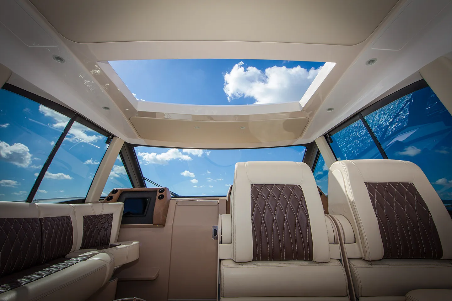 The cockpit itself features an electronic sunroof, and perfectly sculpted and innovatively designed helm seating that converts to create more open seating and conversational space.