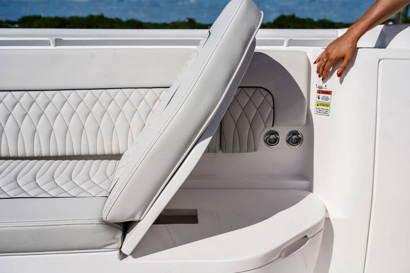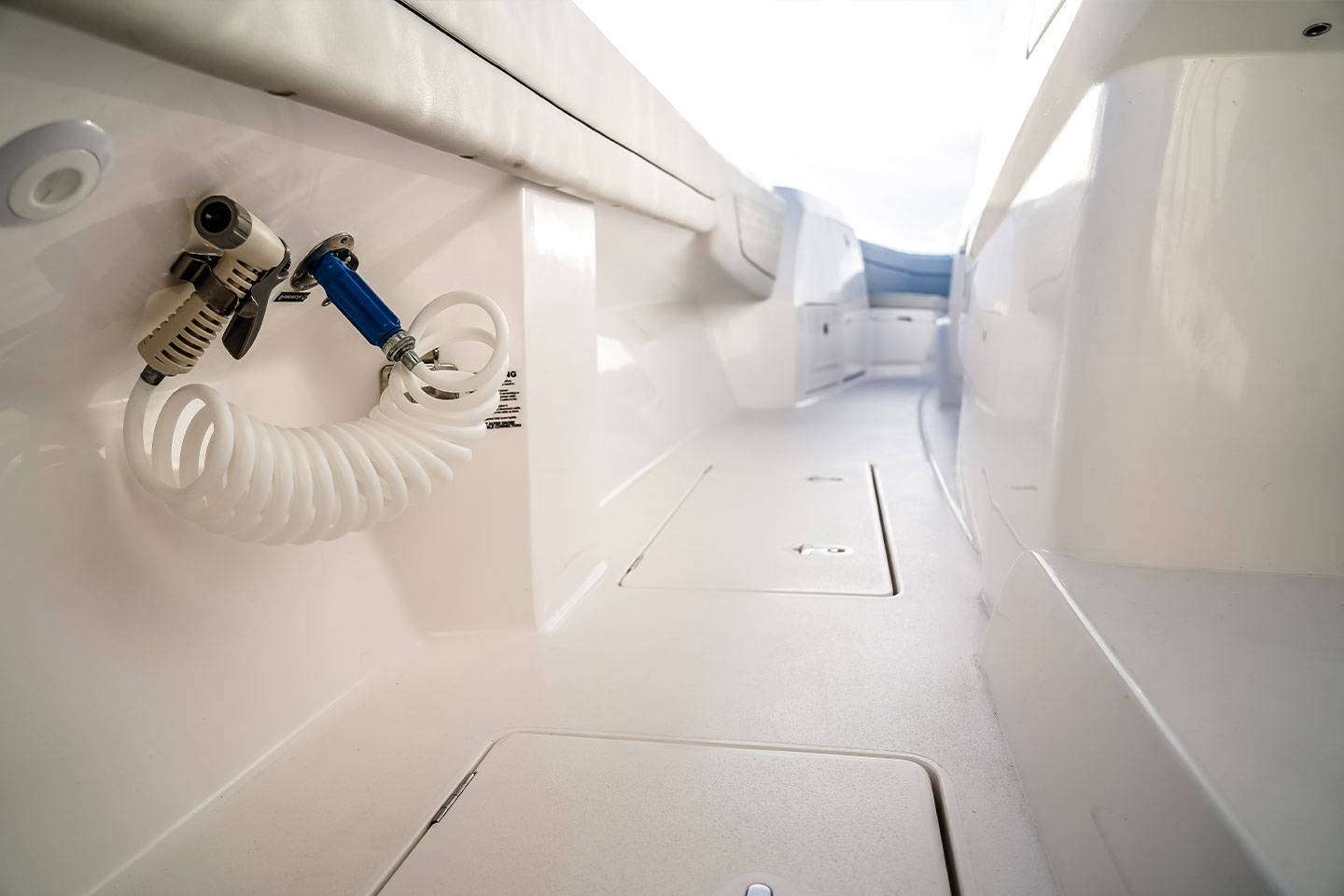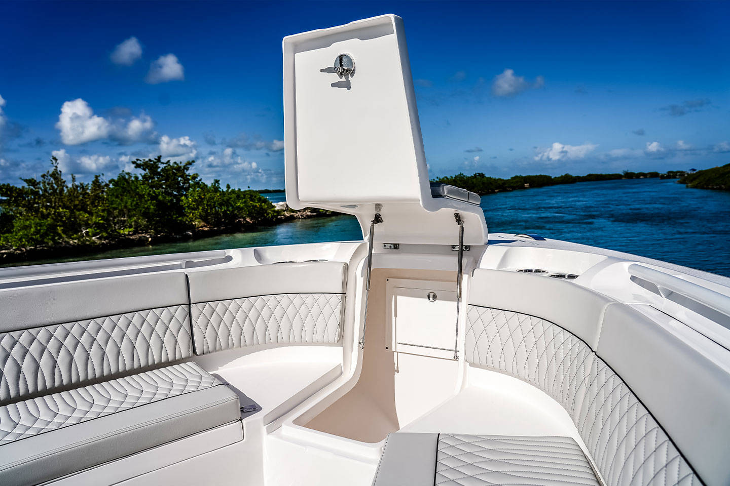 4 Port and Starboard aft above deck storage or optional rigged baitwells with windows makes fishing this aft cockpit more convenient and roomier by not stealing valuable cockpit space.