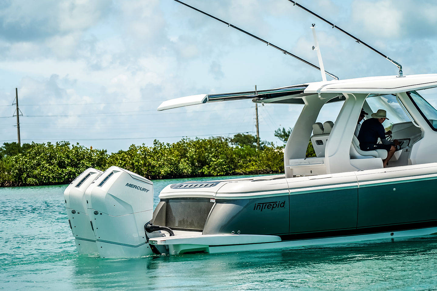 An expanded helm seat station features a full-height, composite T-top and wraparound glass windshield with a wiper for improved visibility and maximum protection from the elements. The wider console provides abundant space for a full array of today’s larger flat-screen electronics. The wider, 12′ 8″ beam and longer hull are perfectly balanced to accommodate the twin to quad engine configurations that let you get out there faster, go farther, and stay longer. Our signature composite stepped hull design provides the incomparably smooth, dry ride, sure-footed handling, and exceptional fuel efficiency that put Intrepid in a class by itself. Luxurious forward seating includes adjustable twin sun pads with a huge storage locker underneath.