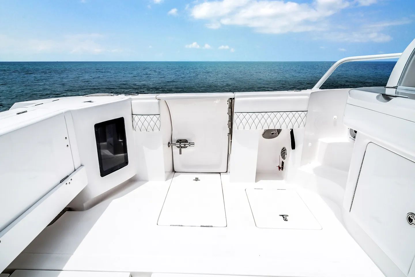 4 Port and Starboard aft above deck storage or optional rigged baitwells with windows makes fishing this aft cockpit more convenient and roomy by not stealing valuable cockpit space.