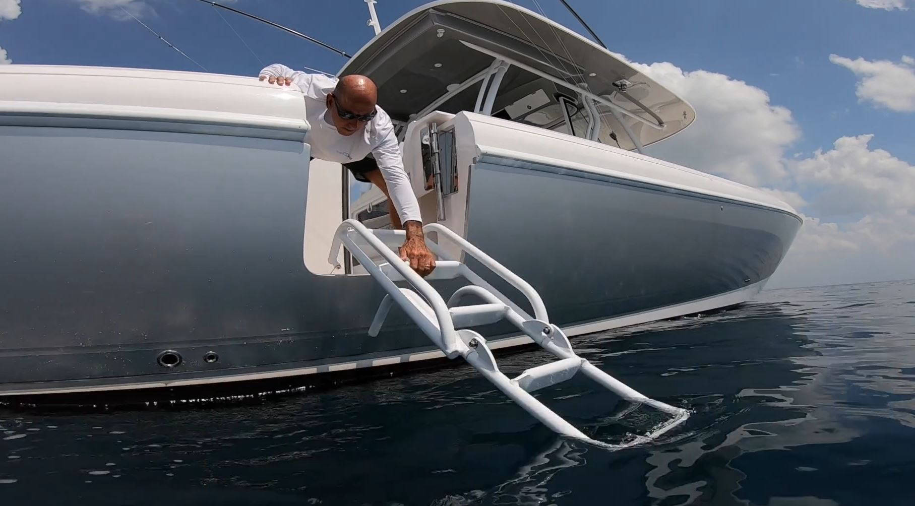 6 Fold-out ladder conveniently stows under the cabin sole and when deployed it allows for easy entry and exit from the water in through the hull side dive door.