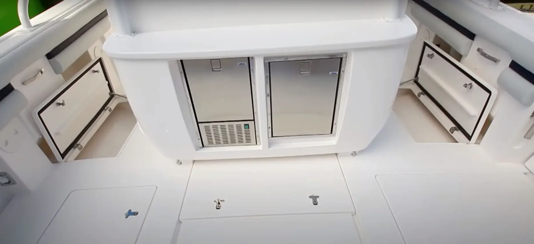11 Aft cockpit cabinet designed to your needs. A).Refrigerator/Icemaker/sink/slide out cooler B). Fishing station C). Remove for second row seating.