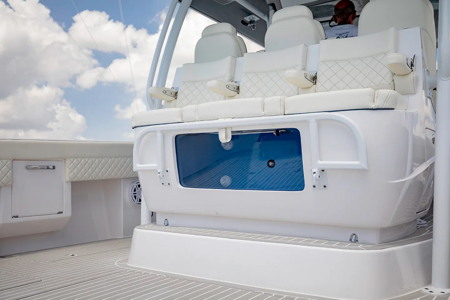 It’s perfectly crafted to battle a 400lb marlin. Or if you prefer to see one face to face, it’s ideal for diving into the depths below to experience them firsthand. The helm features a state-of-the-art platform for electronics, fold-down armrests, footrests, LED lighting and a convenient cooler. An expansive cockpit features rear seating, fish boxes and storage lockers.