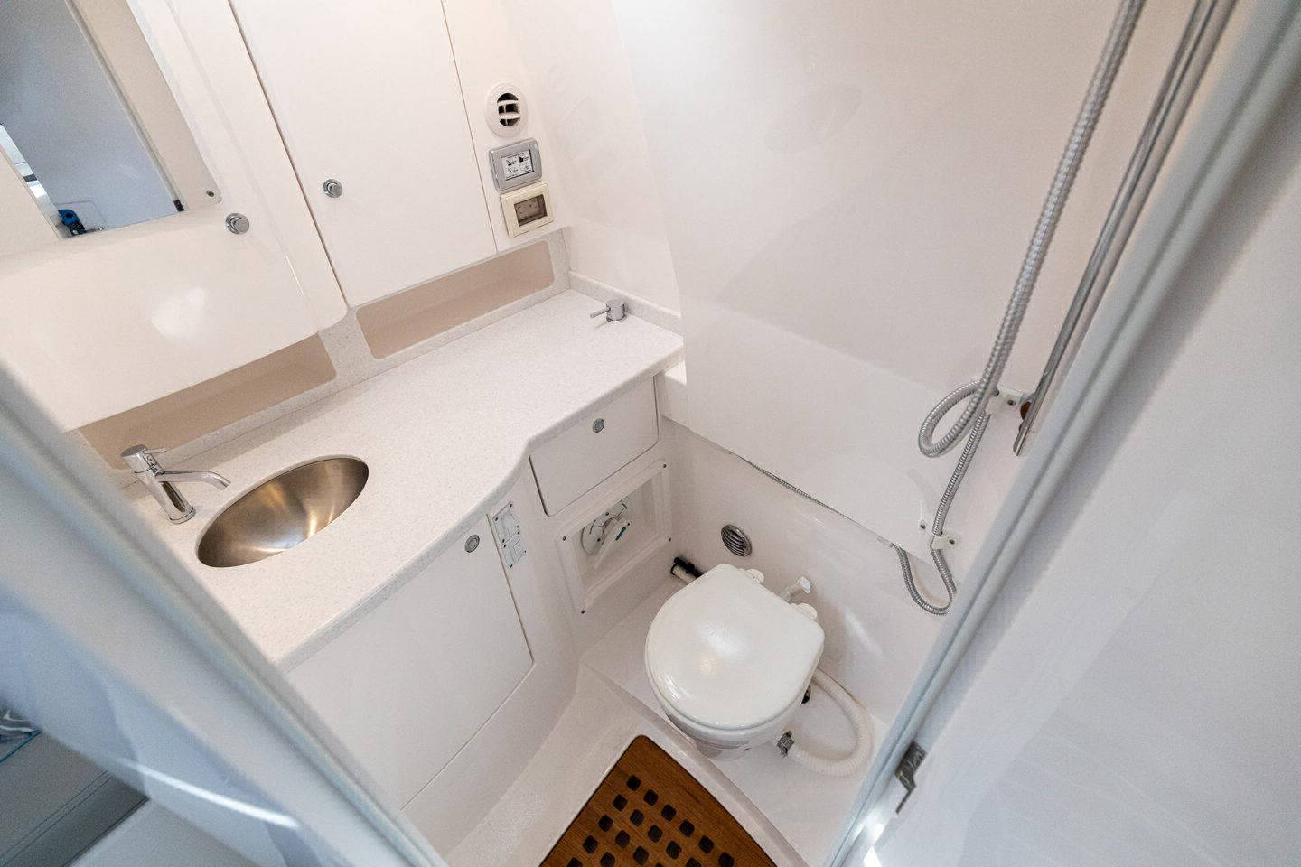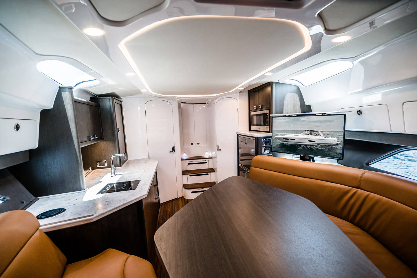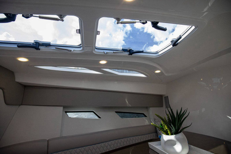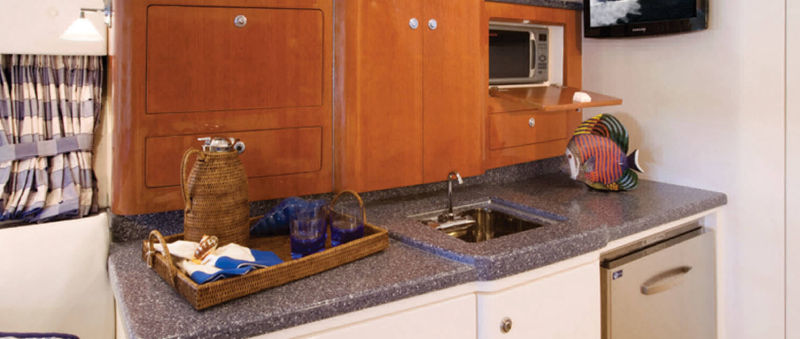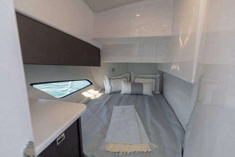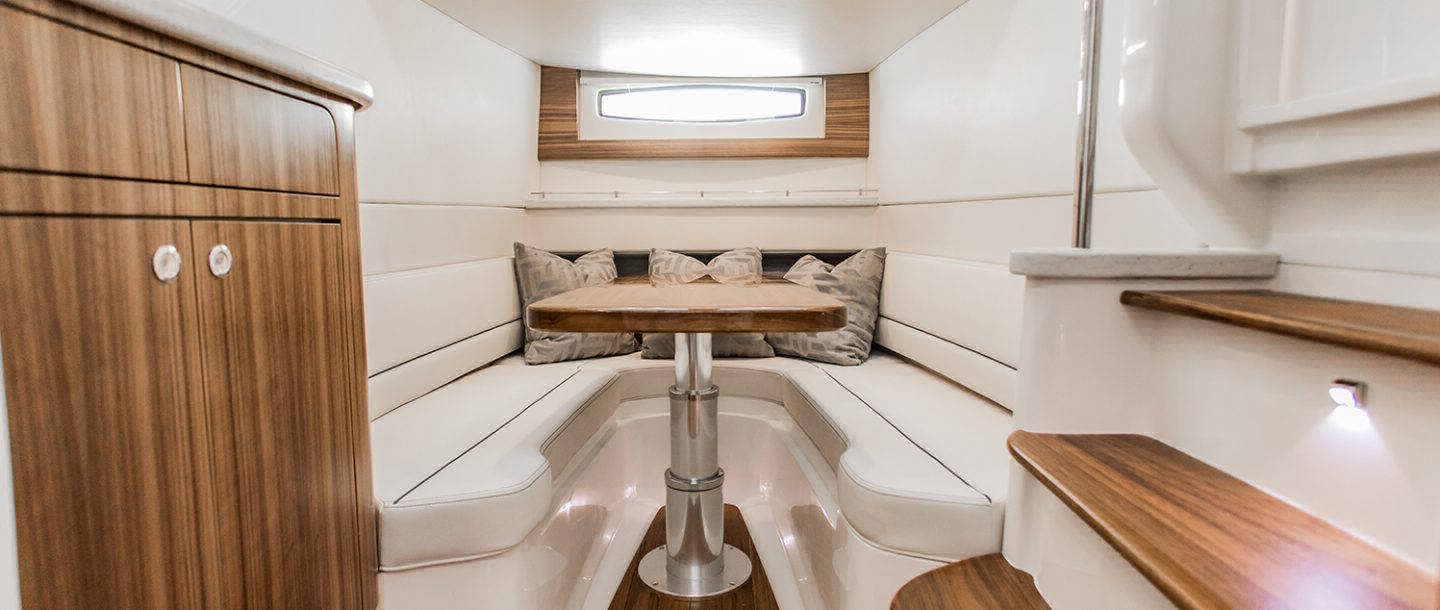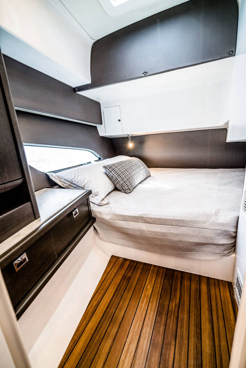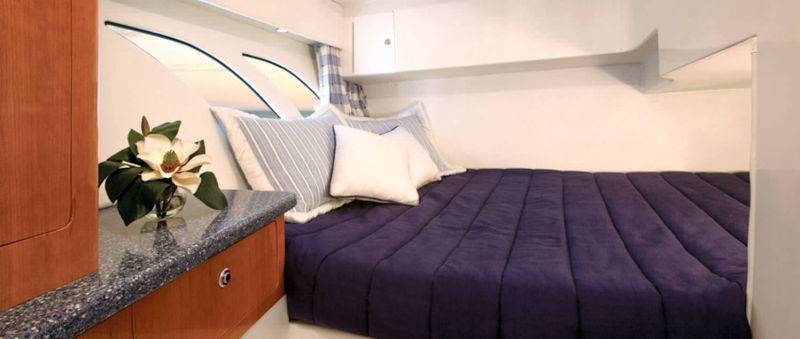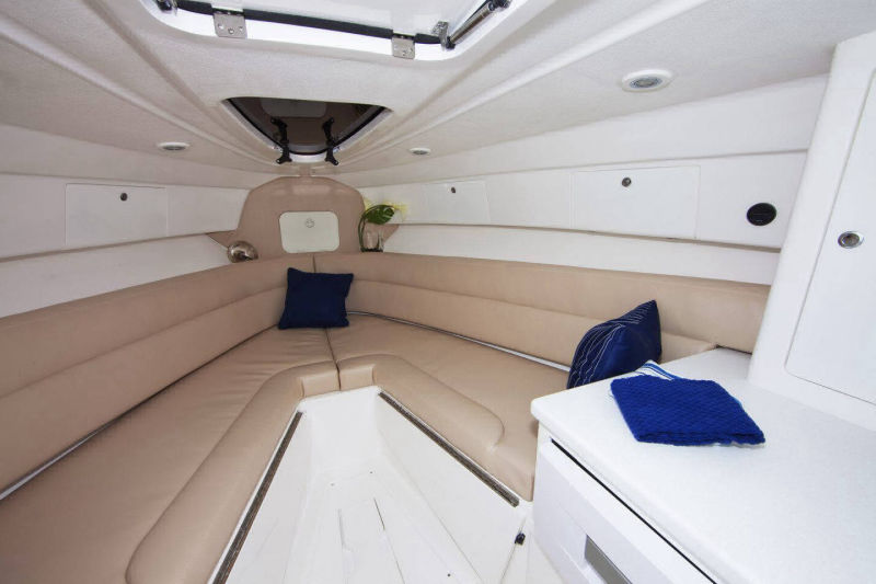 Wraparound forward seating creates a VIP lounge that converts to an alfresco dining area. Below, you’ll find a roomy head with a shower, vanity and sink, a galley with hard surface countertops, refrigerator, sink and high-end cabinetry and a spacious V-berth for luxurious accommodations.